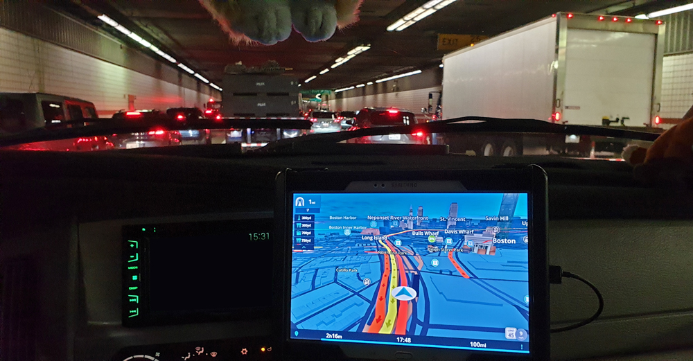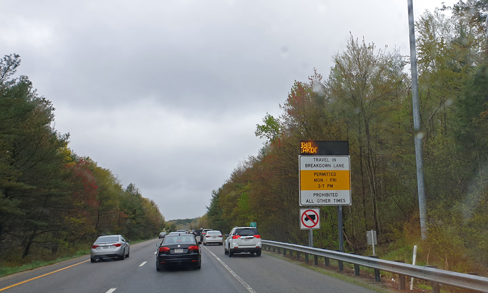 Da wir erst letzten Sommer in Boston waren und das Wetter sehr zu wünschen übrig liess, haben wir die Stadt ausgelassen. Die rund 25 km um bzw. unter Boston durch bis Braintree erwiesen sich als Geduldsprobe. Auch danach war der Verkehr noch heftig und wurde erst nach und nach besser. Da nützt auch die Freigabe des Pannenstreifens als Fahrspur (etwas, das man beim Einfahren auf die Autobahn beachten sollte…) nicht so viel.