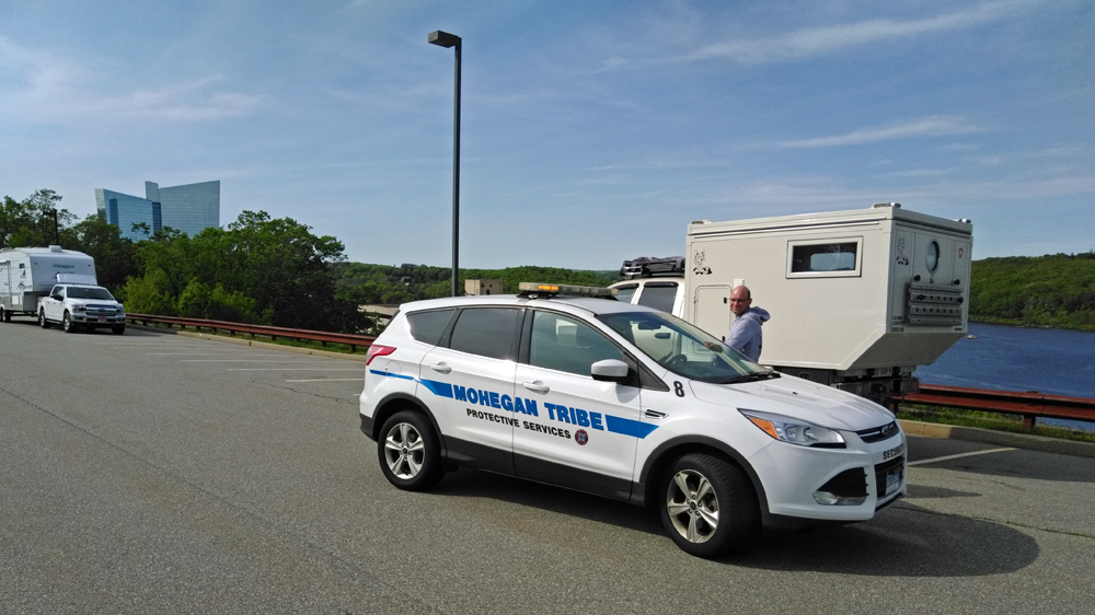 Nördlich von New London übernachten wir (gratis) auf dem RV Parkplatz des Mohegan Sun Casinos hoch über dem Thames River. Dieses Casino und das naheliegende Foxwoods liegen beide in Indianerreservaten (ersteres der Mashantucket Pequot, letzteres der Mohegans). Der Platz hat zwar keine Infrastruktur, ist aber dafür sehr sicher: wenn man hier stehen will, muss man sich bei der Security des Casinos anmelden, die auch immer wieder den Platz kontrolliert. Vom Parkplatz fährt im Viertelstundentakt – und das 24/7! – ein Shuttle-Bus zum Casino. Nachdem wir im Camper gemütlich gegessen haben, lassen wir uns die Gelegenheit nicht entgehen, einen Blick ins riesige Casino zu werfen. Die Architektur (und auch der benachbarten Tankstelle) ist vom indianischen Erbe beeinflusst und es gibt auch eine ganz kleine Ausstellung zu den Mohegans und ihrer ehemaligen Lebensweise. Die Mohegans (bekannt aus dem Roman «Der Letze Mohikaner», wobei Cooper sie vermutlich mit den Mahicans verwechselt hat) haben sich früh mit den Engländern verbündet und komplett assimiliert. Die letzte «native speaker» starb Anfang des 20. Jahrhunderts, doch bemühten sich die Nachfahren der Mohegans um die Bewahrung bzw. das Wiederauflebenlassen der Sitten und Bräuche und erhielten in den 90er Jahren die staatliche Anerkennung als Stamm und ein Reservat (mit eigener Gesetzgebung, Feuerwehr etc.). Der deutsche Wiki-Artikel zur Geschichte des Stammes ist übrigens sehr ausführlich, während der englische Eintrag nur sehr kurz und oberflächlich daherkommt.