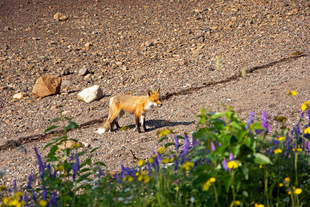 Es hat unglaublich viele Tiere zu Land, zu Wasser und in der Luft: Elche sind geradezu eine Landplage, mit etwas Glück sieht man Karibus, Polar- und Rotfüchse tummeln sich auch tagsüber, an die Papageientaucher und andere (See-)Vögel kommt man ganz nah ran, die Lachse lassen sich beim Wandern beobachten und die Wale fressen und spielen ganz nah am Ufer. Es wäre absolut paradiesisch, gäbe es nicht auch eine Vielzahl von verschiedenen Insekten, von denen einige das Blut der Touristen ganz besonders schätzen…