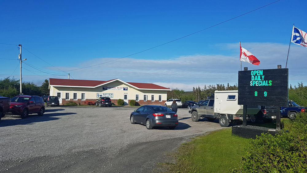 Die Überfahrt auf der erst im Dezember 2018 als Occasion von Europa importierten Fähre war recht angenehm. Das Verpflegungsangebot hat uns bereits auf die Neufundländische Haute Cuisine vorbereitet: Burger, Pommes, frittiertes Poulet oder Fisch und Poutine… (Ok, es gäbe auch noch echte Spezialitäten wie, Kabeljauzungen und -backen, Fish and Brewis with Scrunchions und Jigg’s Dinner – ersteres eine Mischung aus hartem Brot mit zerzupftem Salzfisch, angereichert mit Speckwürfeln in ihrem ausgelassenem Fett, letzteres gekochtes gesalzenes Rind- oder Schweinefleisch mit Kohl, Kartoffeln, Karotten, Rutabaga und Erbsenpudding; diese Gerichte erscheinen aber nur selten auf den Menükarten).