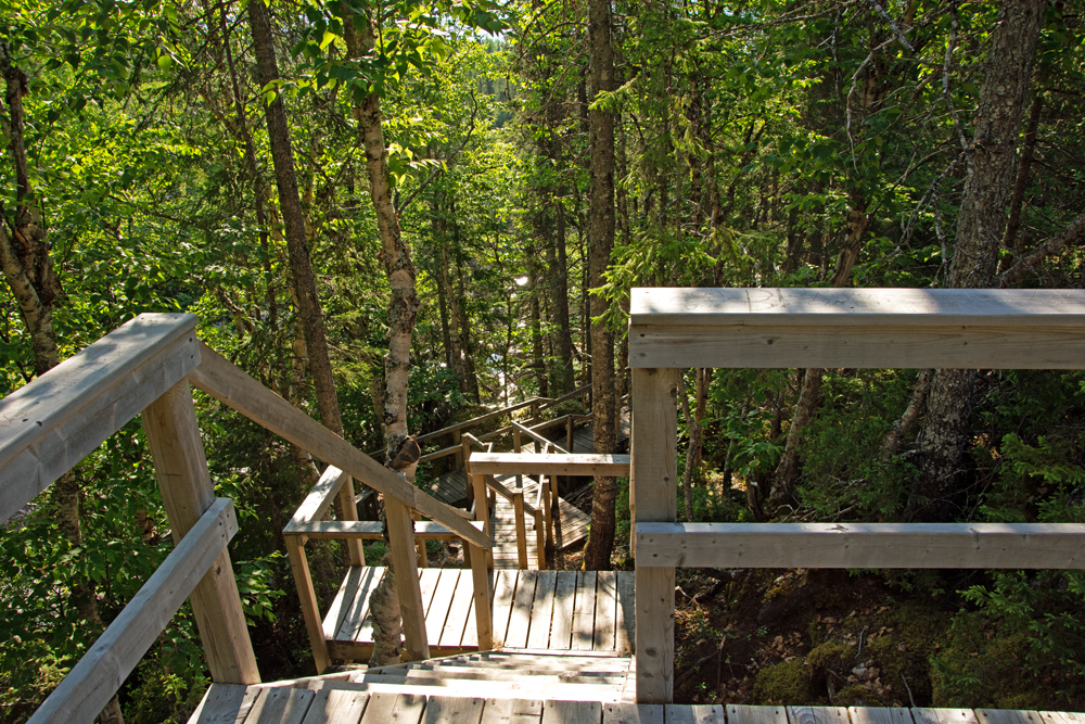 Am Torrent River besichtigen wir eigentlich mehr zufällig eine Lachstreppe an einem Wasserfall. Die Treppe steht in Zusammenhang mit einem kleinen Forschungszentrum, wo es eine interessante Ausstellung über die Atlantischen Lachse und das Projekt am Torrent River bekommen. So erfahren wir zum Beispiel, dass die Atlantischen Lachse im Gegenatz zu ihren pazifischen "Kollegen" während ihres Lebens bis zu sieben Mal zu ihrem Ursprungsort zurückkehren können, um zu laichen. Oder dass die Treppe eingerichtet wurde, weil die Lachse den Wasserfall zuvor praktisch nicht aus eigener Kraft überwinden konnten; nun steht ihnen ein viel grösseres Laichgebiet zur Verfügung und die Bestände im Fluss haben sich erholt.