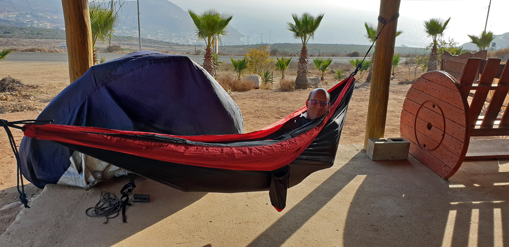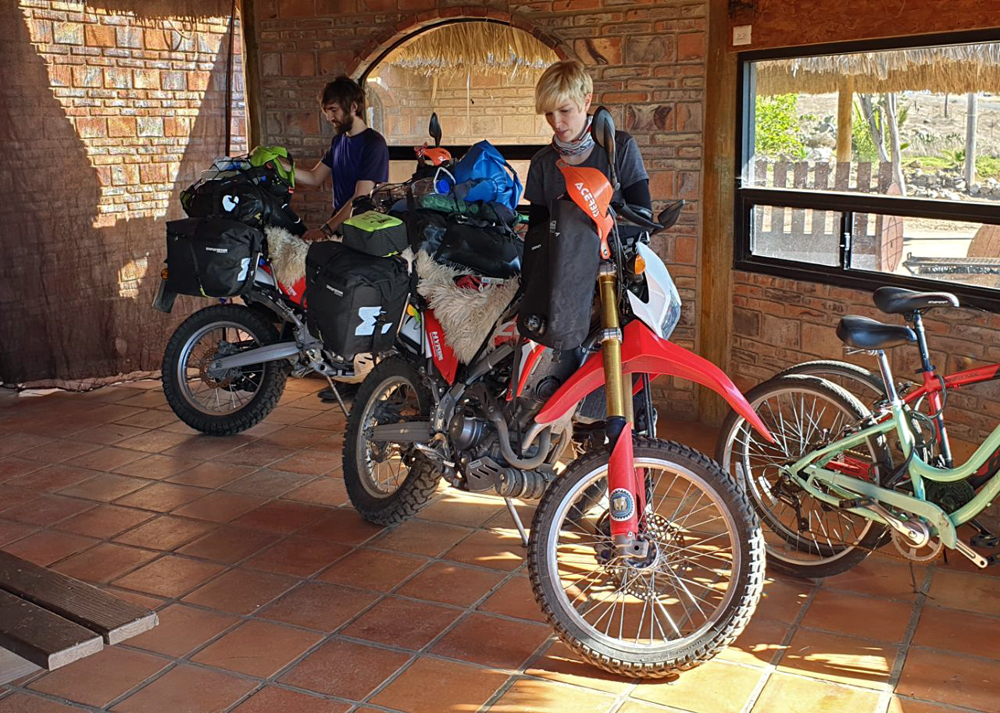Die Bekanntschaft von Stefanie und Lukas, die nur mit Zelt, Schlafsäcken und Packtaschen „bewaffnet“ sind, zeigt uns wieder einmal, wie luxuriös wir mit unserem 4 m2-Häuschen unterwegs sind: Wir haben feste Wände, Standheizung (und Klimaanlage), einen Dieselkocher mit zwei Kochfeldern, eine Kaffeemaschine, mit Sonne unbegrenzt Strom, einen Kühlschrank und gefiltertes Trinkwasser! (Wir haben den Tank allerdings inzwischen mit gekauftem „purified Water“ aus der „Fabrik“ gefüllt, da das Brauchwasser im Campo 7 einen beträchtlichen Gehalt an Salz aufweist, das vom Seagull-Filter nicht entfernt wird).