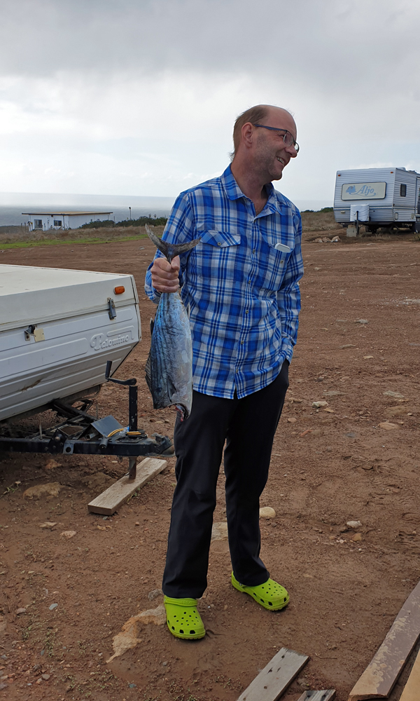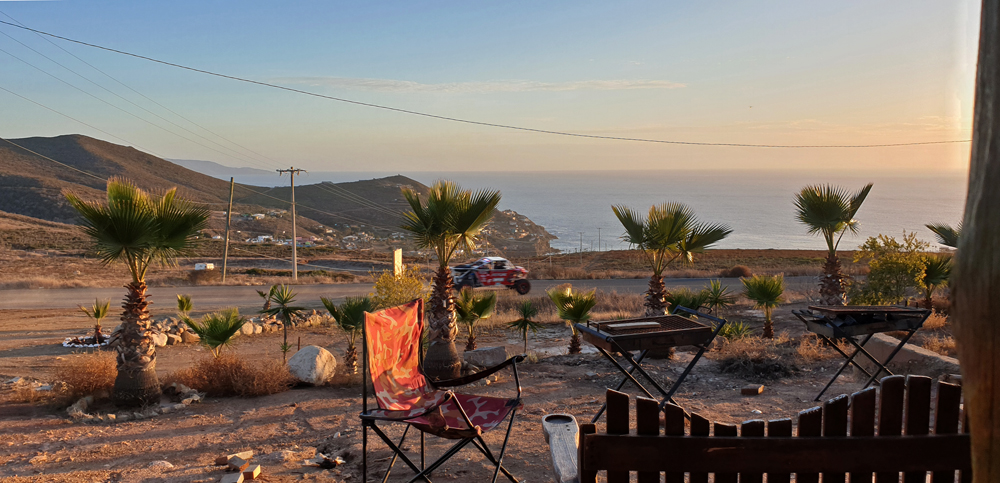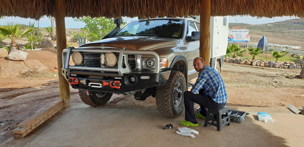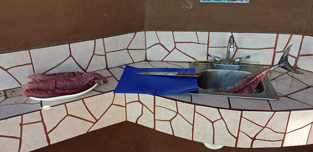 Auch sonst läuft immer so einiges: von Baja Race-Teilnehmern, die vorbeifahren, um La Bufadora zu besuchen, über nächtliche Polizei-Einsätze (nein, nicht wegen uns 😉 ), Coyoten und Skorpione bis hin zu einem Auto, das die Abzweigung nicht rechtzeitig erwischt hat, und von Riccardo mit seinem Jeep von den Begrenzungssteinen gezogen werden muss. Letzterer schenkt uns auch immer wieder einmal frisch gefischten, zwei Kilogramm-Bonito, den wir unter uns aufteilen.
