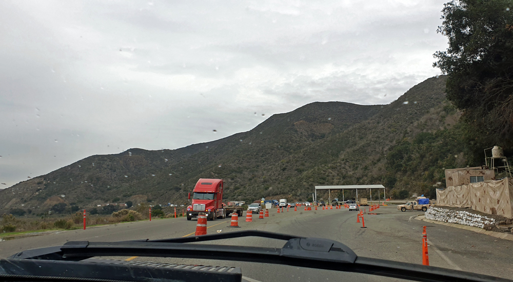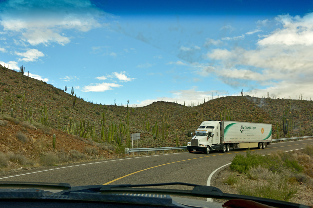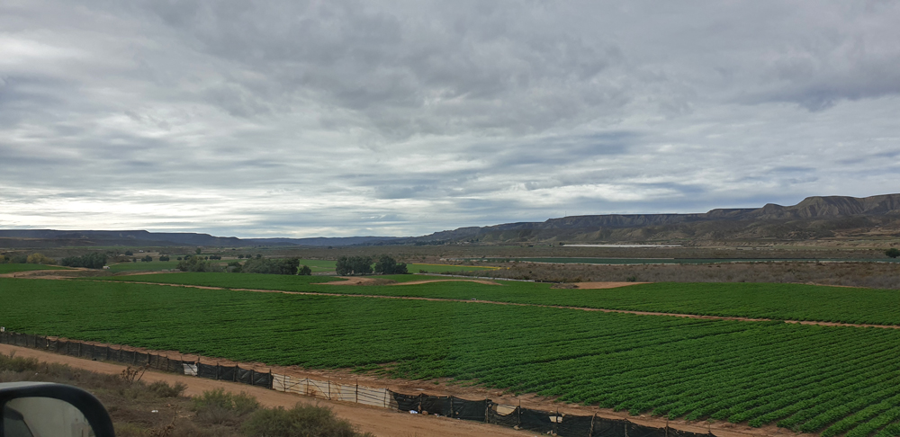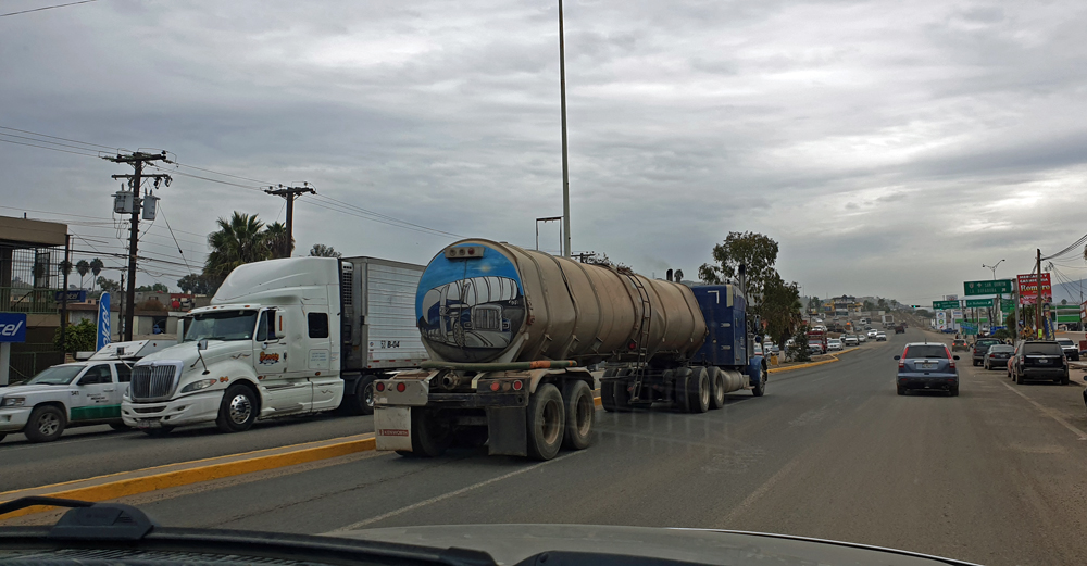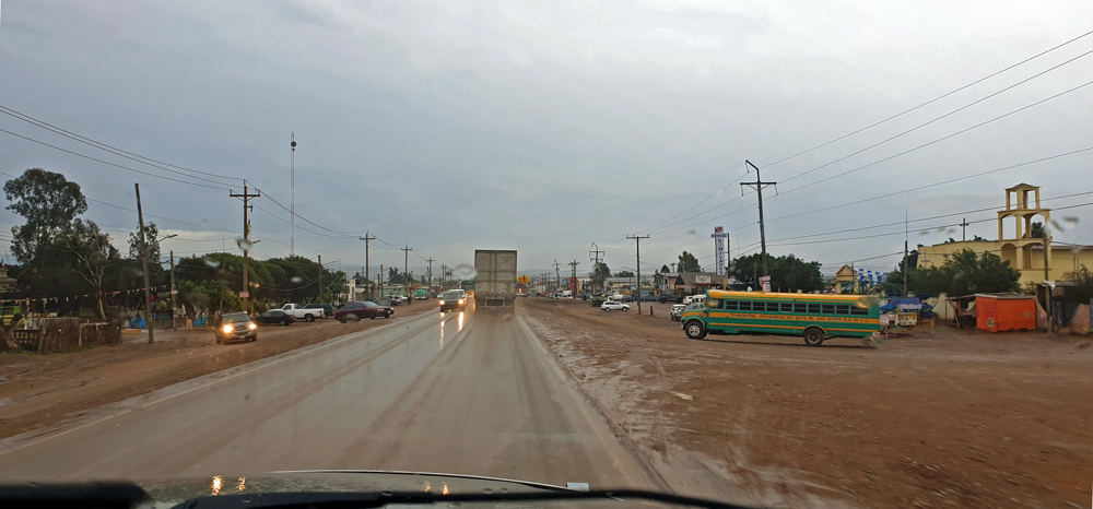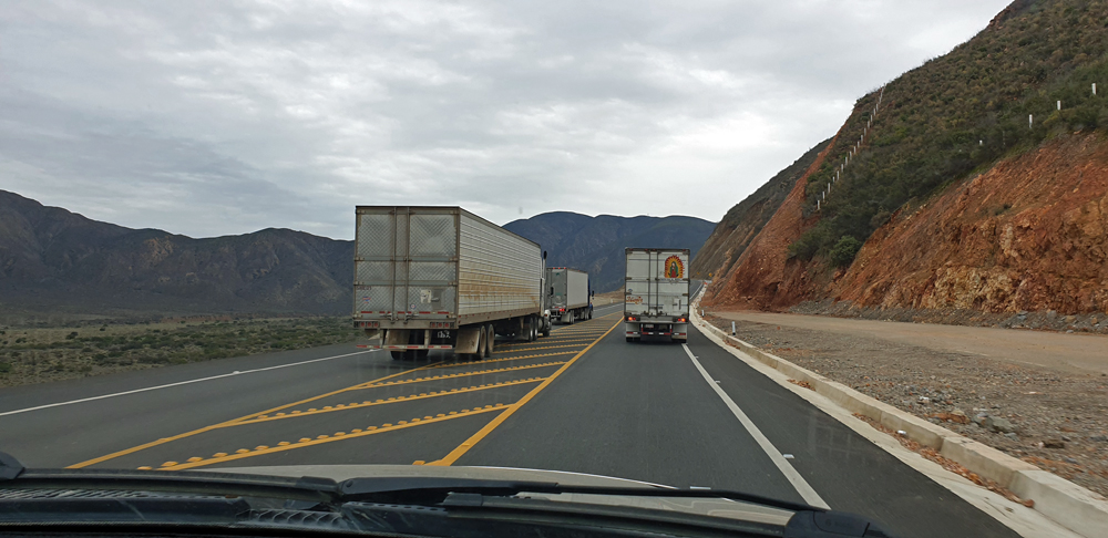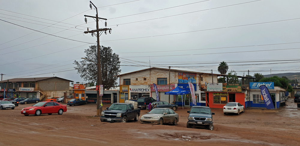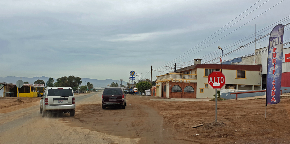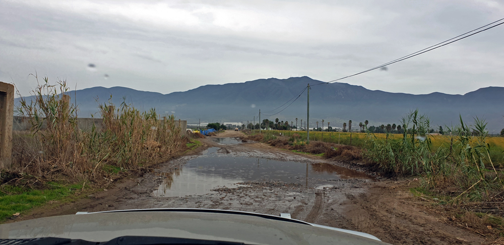 Nachdem wir nochmals in der «Fabrik» unsere Wassertanks und beim Calimax unsere Vorratsschränke gefüllt haben, geht’s los. Leider kommt schon wieder der Regen und es ist sehr unschön zu fahren. Von Ensenada bis fast San Quintín wird – wo immer möglich – im grossen Stil Landwirtschaft betrieben. Offene Felder und vor allem Gewächshäuser für Beeren und andere Produkte ziehen sich bis zum Horizont. Dazwischen finden sich immer wieder kleinere und grössere Dörfer. Geteert ist nur gerade die Überlandstrasse und durch die vielen Autos, Traktoren und Lastwagen, die überall einfahren, ist der Asphalt mit Schlamm überzogen. Kurz hinter Ensenada passieren wir auch den ersten Militärposten, der uns allerdings nicht betrifft, weil hier nur der Verkehr nach Norden kontrolliert wird.