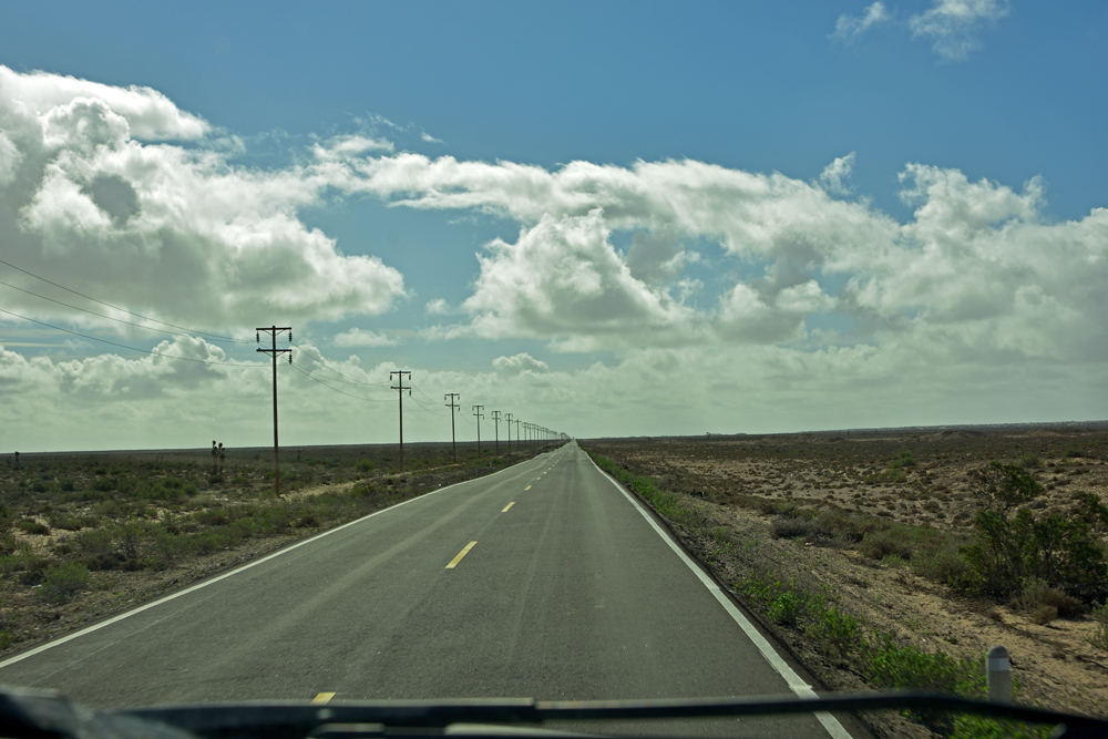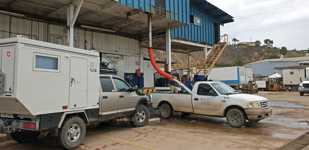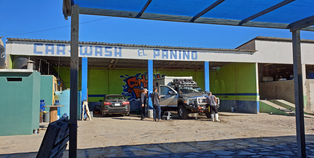 Also geht es wieder nach Bahía de los Ángeles und die 70 km zurück auf die MEX-1. Diese verläuft nun fast gerade Richtung Süden und an die Westküste. Auf dem 28. Breitengrad passieren wir die Grenze zur Baja California Sur. Das Militär interessiert sich nicht für uns, aber am Landwirtschafts-Checkpoint werden wir nach Früchten und Gemüsen gefragt und für 20 Pesos unser Fahrzeug von unten desinfiziert. Hier ist auch eine Zeitgrenze, so dass wir nun «nur» noch 8 Stunden Zeitverschiebung gegenüber der Schweiz haben. Kurz hinter der Grenze machen wir Halt in Guerrero Negro, einer recht neuen Stadt, die ihre Existenz der Salzgewinnung verdankt (der Name Guerrero Negro kommt übrigens vom amerikanischen Walfangschiff «Black Warrior», das in der Laguneneinfahrt gesunken ist). Ab ca. 20. Dezember bis im März ist es auch ein Hot Spot für die Beobachtung von Grauwalen, die hier in Laguna Ojo de Liebre ihre Kälber aufziehen. Wir sind allerdings noch zu früh dafür, werden aber sicher auf dem Rückweg die Wale beobachten! Dafür übernachten wir wieder auf einem RV Park (El Malarrimo) mit heissen Duschen und einem weit herum bekannten Restaurant hat, das wir natürlich testen müssen… (Es war super!!!). Die Wäsche geht wieder in die Lavamatica (diesmal hatten wir Pech, da die ganzen Tücher und Lappen nachher zwar sauber waren, aber sehr unappetitlich gerochen haben; die Kleider waren zum Glück in Ordnung). Am nächsten Morgen wird vor der Abfahrt Wasser nachgefüllt und das Auto waschen gelassen – dringendst nötig nach der Schlammschlacht nach Ensenada… Die Handwäsche, inkl. Reinigung des Innenraums, die etwa eineinhalb Stunden in Anspruch genommen hat, hat hier nur 200 Pesos, umgerechnet ungefähr CHF/USD 10.- gekostet!