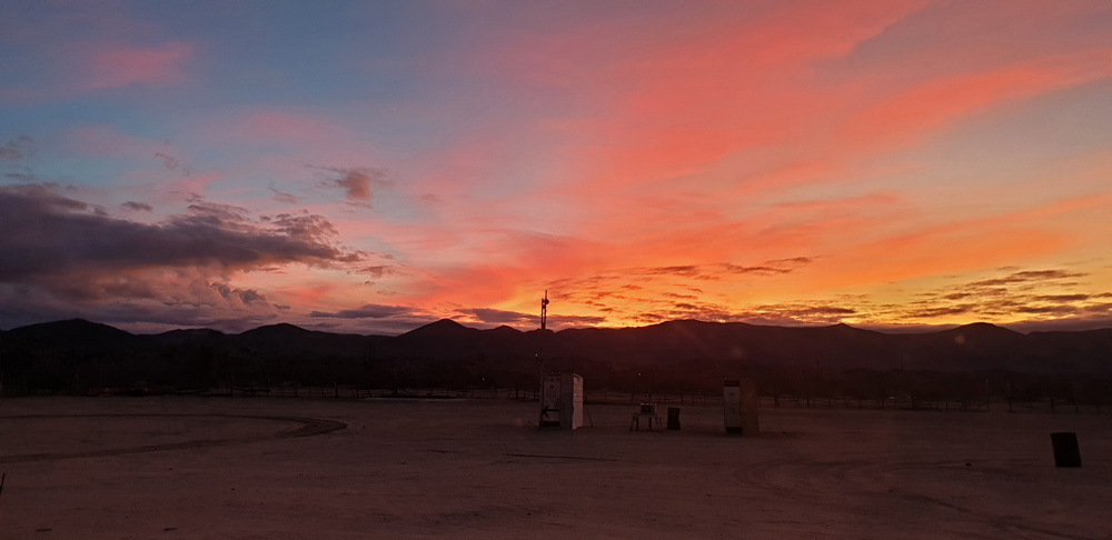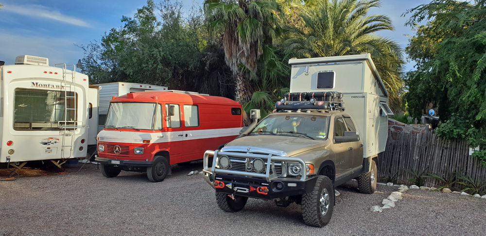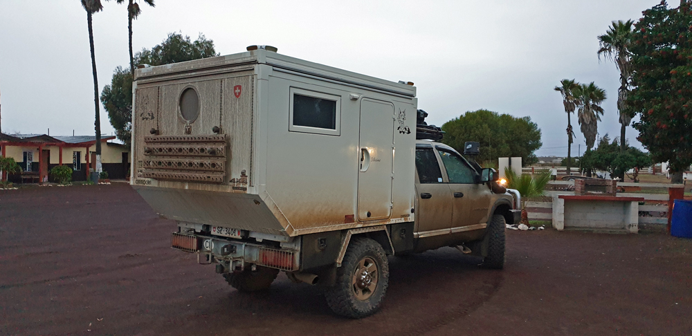 Von Ensenada aus wollten wir eigentlich bis zum «Canyon Camp» fahren, ein freier bis günstiger Stellplatz am Meer, den wir auf iOverlander ausgeguckt hatten. Wir finden das Fahren im dichten Verkehr bei schlechter Sicht allerdings recht mühsam und fürchten auch, dass wir nicht mehr rechtzeitig vor der Dunkelheit ankommen, so dass wir bei San Quintín übernachten. (Fahren im Dunkeln ist wegen Topes, unbeleuchteter Verkehrsteilnehmer und Rindern etc. auf der Strasse ein No-Go). Der anvisierte und von unseren Motorradfreunden als gut befundene Platz war genau heute zu, aber bei «Don Eddie’s Landing» fanden wir eine kleine Oase, inklusive feinem Restaurant und schöner, heisser Dusche.