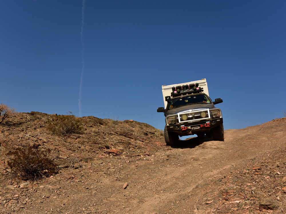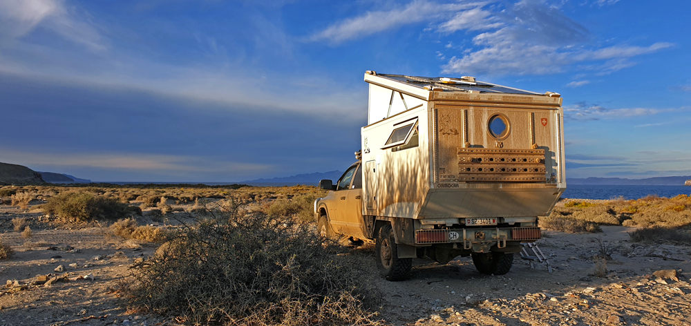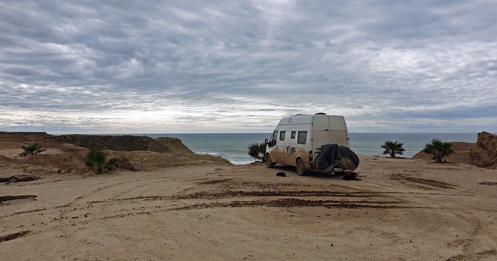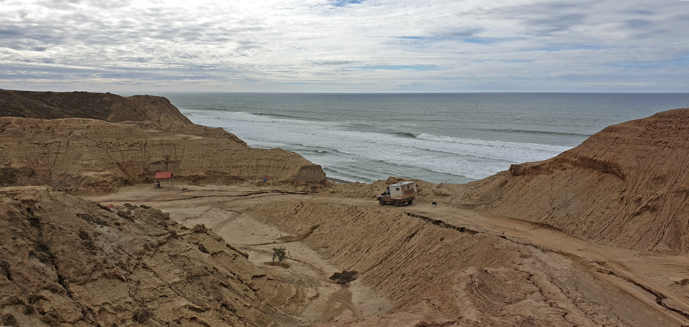 Am nächsten Morgen sieht die Welt schon wieder anders aus: die Sonne scheint und die Strassen trocknen ab. Kurz hinter San Quintín hört die Landwirtschaft auf und damit gehen auch die Besiedlung und der Verkehr massiv zurück. Wir folgen der Küste und fahren schnell zum Canyon Camp, wo sich Tati und Vagner am Abend vorher installiert haben, um Hallo zu sagen.
