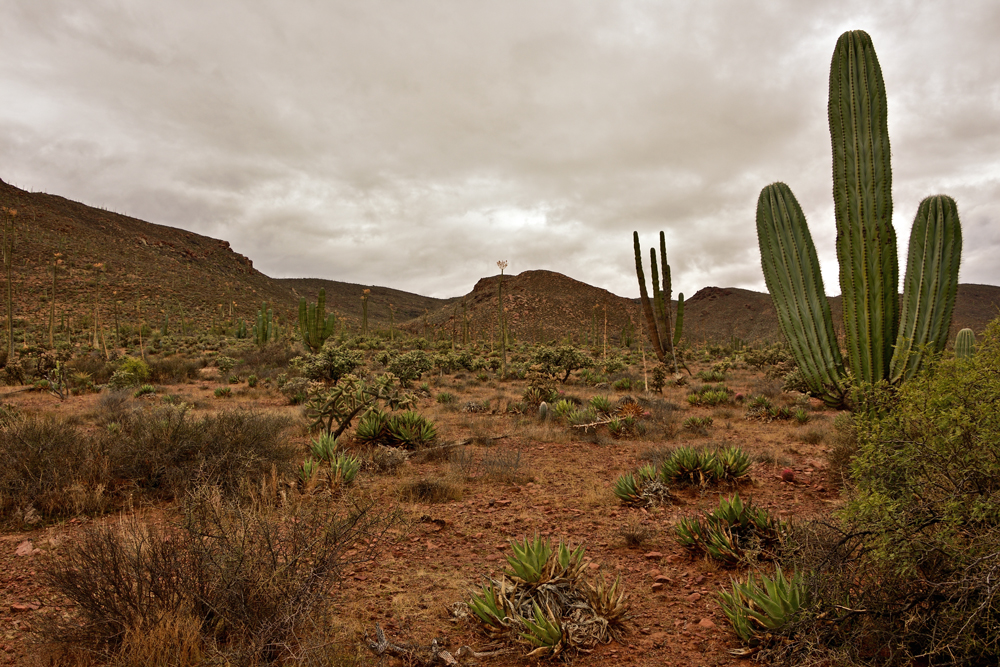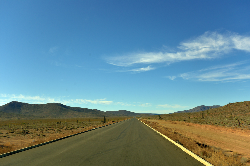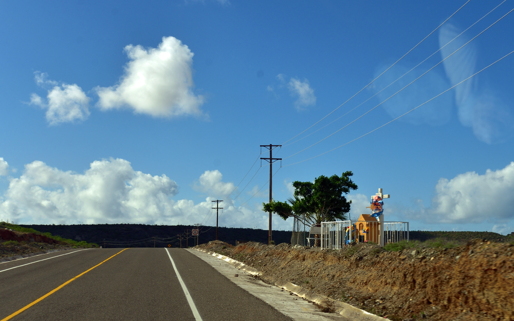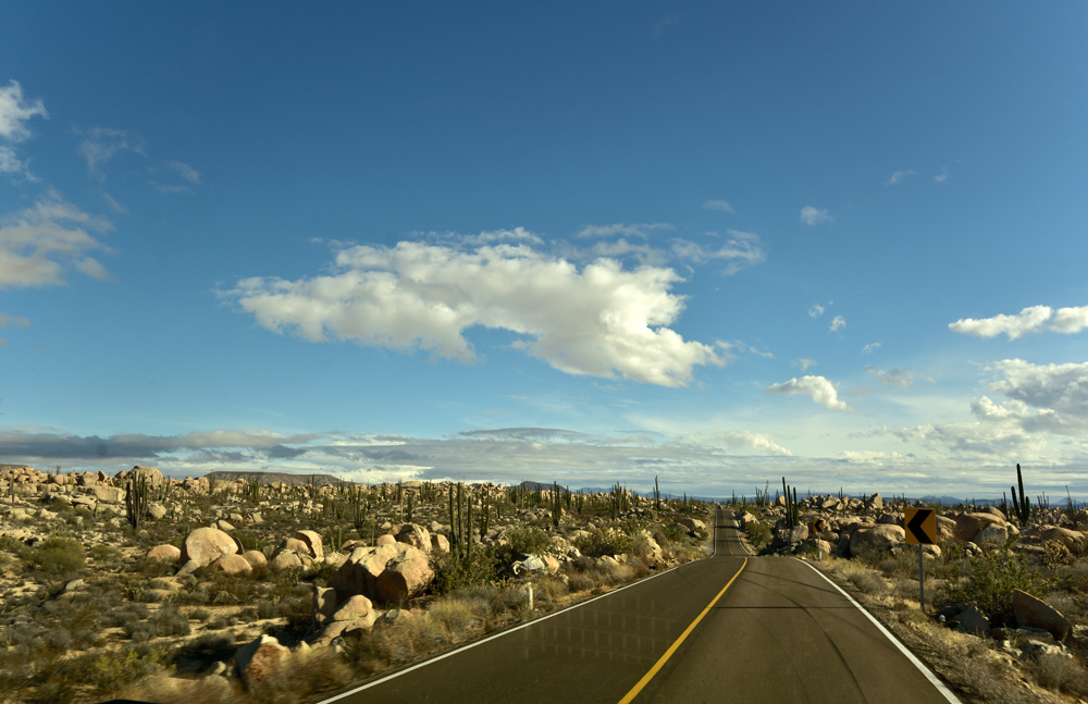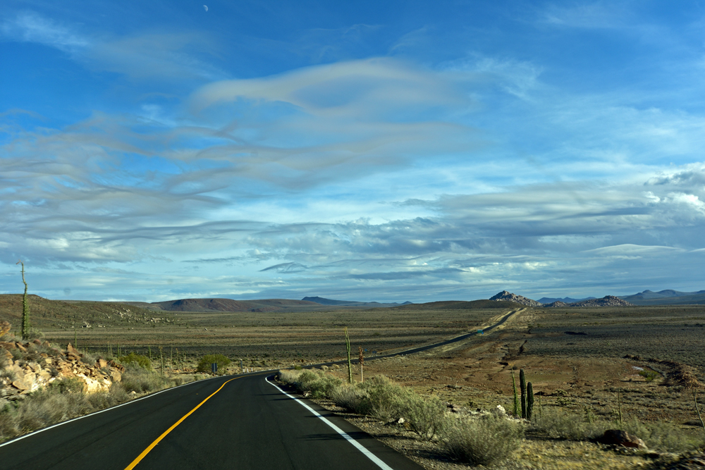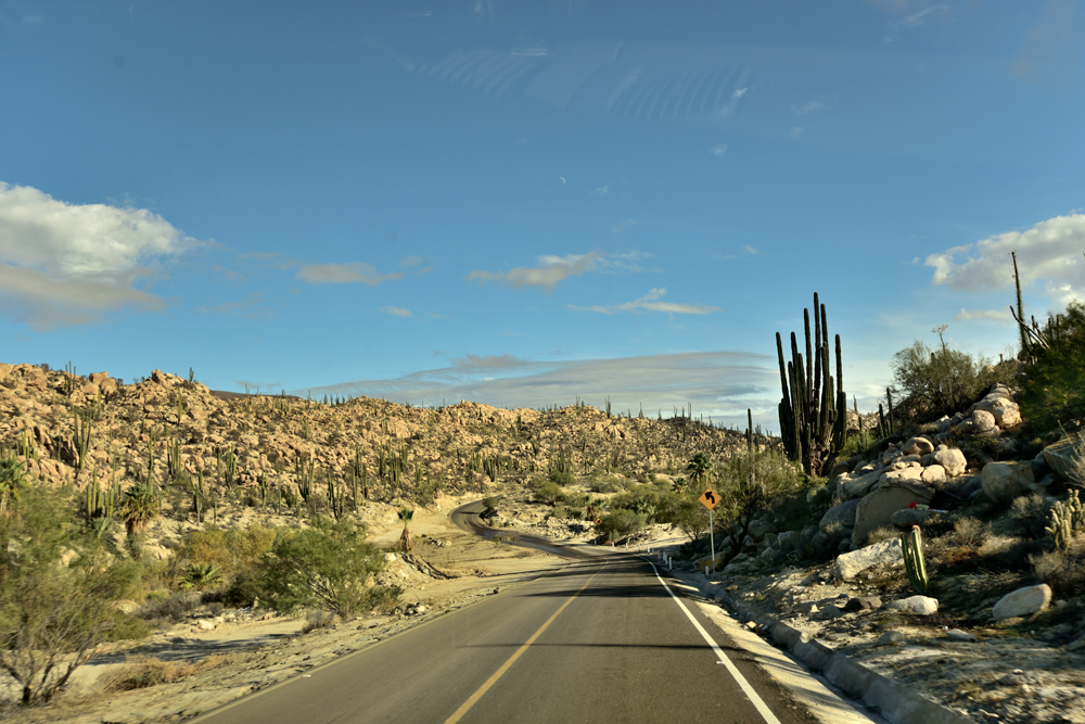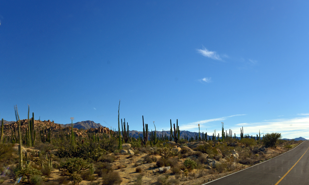 In El Rosario biegt die MEX-1 ins Inland ab. Ab hier gibt es für rund 300 km praktisch keine Besiedlung und vor allem keine Tankstellen (sog. «Baja Gas Gap»). Dafür beginnt eine grandiose Wüstenlandschaft. Wir fahren durch eine hügelig-gebirgige Landschaft, wunderschöne Hochebenen mit grossen, gerundeten Granit-Kieseln («Cataviña boulder fields») und vor allem ein Kaktus-Wunderland! Besonders auffällig sind die riesigen Cardón (Pachycereus pringlei), die an Saguaros erinnern, und die fast ebenso grossen Cirios (Fouquieria columnaris), die aussehen, wie umgekehrt wachsende Karotten. Beide kommen nur auf der Baja California und rin wenig im angrenzenden Festland-Bundesstaat Sonora vor. Wir können uns nicht sattsehen! Auch die enge, teils gewundene und direkt neben der Seitenlinie steil abfallende Strasse lädt nicht zum vor sich hindösen ein, vor allem, wenn ein Lastwagen oder grad ein ganzer Lastwagenzug entgegenkommt. Wie gefährlich diese Strasse vor allem für LKWs ist, wird uns durch die unzähligen Gedenkstätten, die an gewissen Stellen aufgrund ihrer Dichte schon fast Friedhofcharakter haben, drastisch vor Augen geführt. Immerhin wird punktuell an der Verbesserung dieser einzigen durchgehenden Strasse gearbeitet.