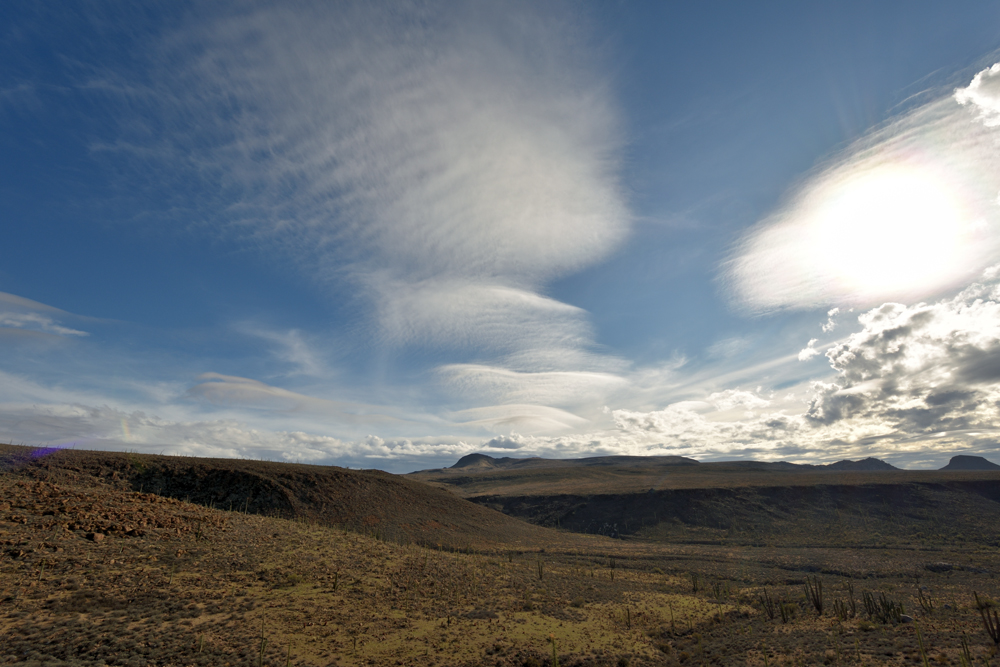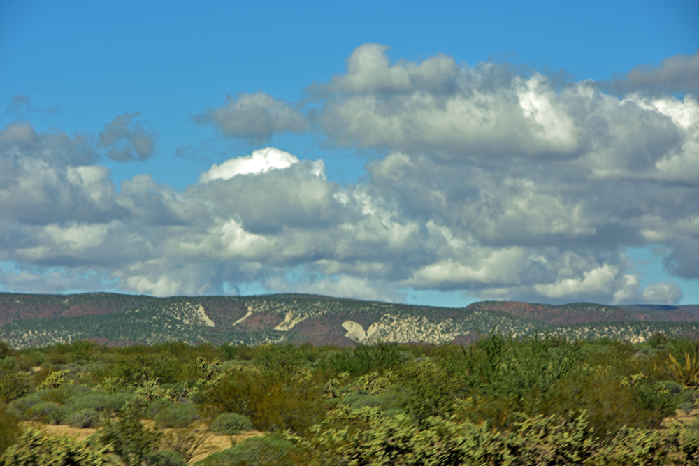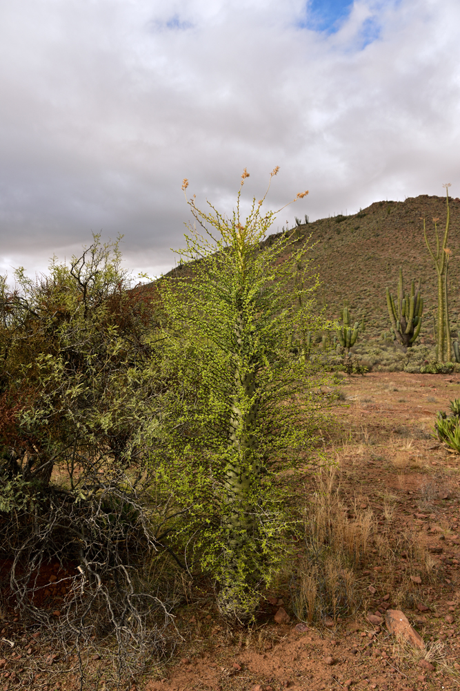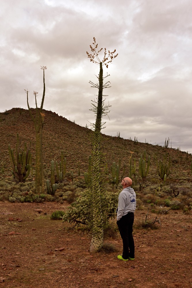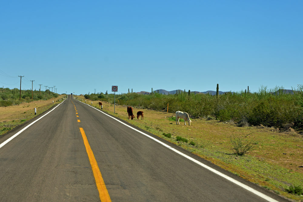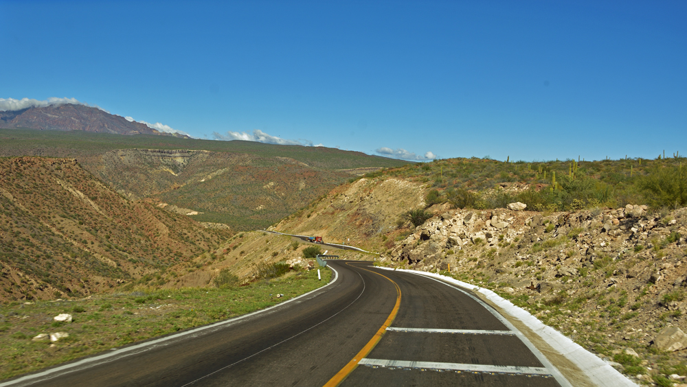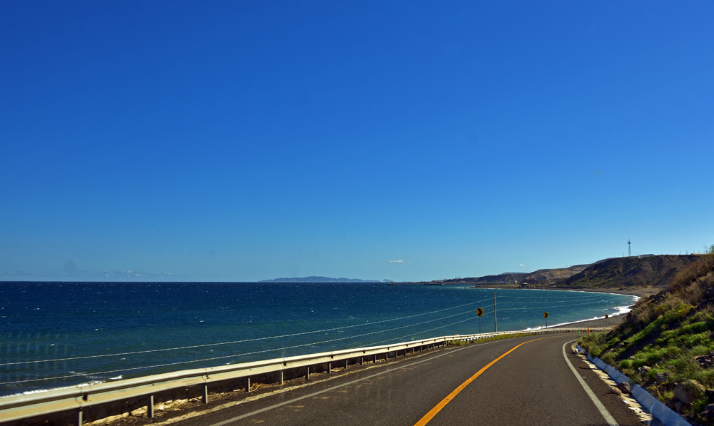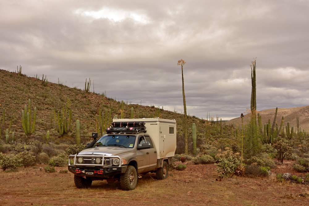 In El Rosario biegt die MEX-1 ins Inland ab. Ab hier gibt es für rund 300 km praktisch keine Besiedlung und vor allem keine Tankstellen (sog. «Baja Gas Gap»). Dafür beginnt eine grandiose Wüstenlandschaft. Wir fahren durch eine hügelig-gebirgige Landschaft, wunderschöne Hochebenen mit grossen, gerundeten Granit-Kieseln («Cataviña boulder fields») und vor allem ein Kaktus-Wunderland! Besonders auffällig sind die riesigen Cardón (Pachycereus pringlei), die an Saguaros erinnern, und die fast ebenso grossen Cirios (Fouquieria columnaris), die aussehen, wie umgekehrt wachsende Karotten. Beide kommen nur auf der Baja California und rin wenig im angrenzenden Festland-Bundesstaat Sonora vor. Wir können uns nicht sattsehen! Auch die enge, teils gewundene und direkt neben der Seitenlinie steil abfallende Strasse lädt nicht zum vor sich hindösen ein, vor allem, wenn ein Lastwagen oder grad ein ganzer Lastwagenzug entgegenkommt. Wie gefährlich diese Strasse vor allem für LKWs ist, wird uns durch die unzähligen Gedenkstätten, die an gewissen Stellen aufgrund ihrer Dichte schon fast Friedhofcharakter haben, drastisch vor Augen geführt. Immerhin wird punktuell an der Verbesserung dieser einzigen durchgehenden Strasse gearbeitet.