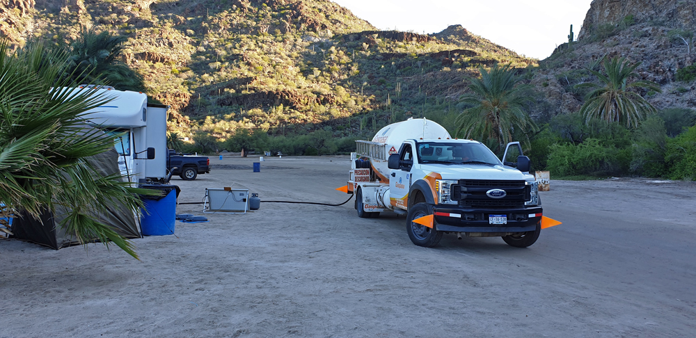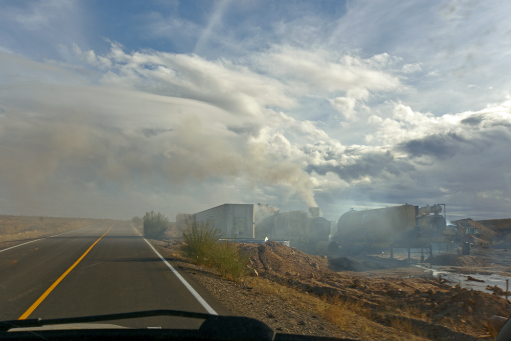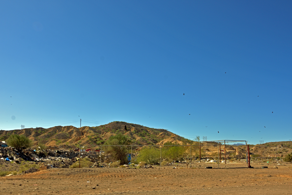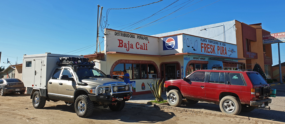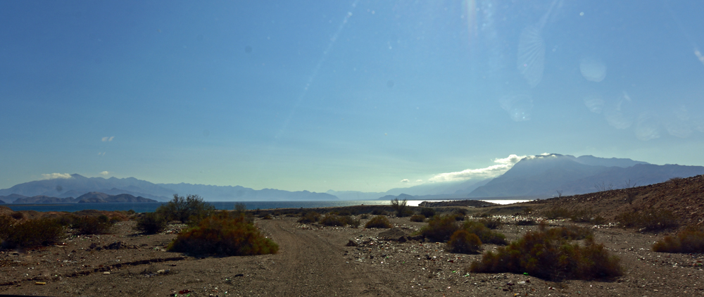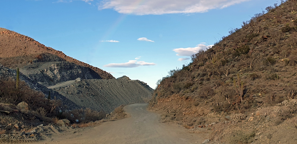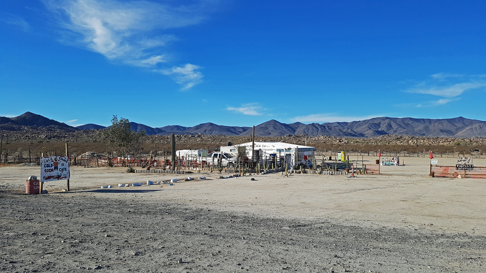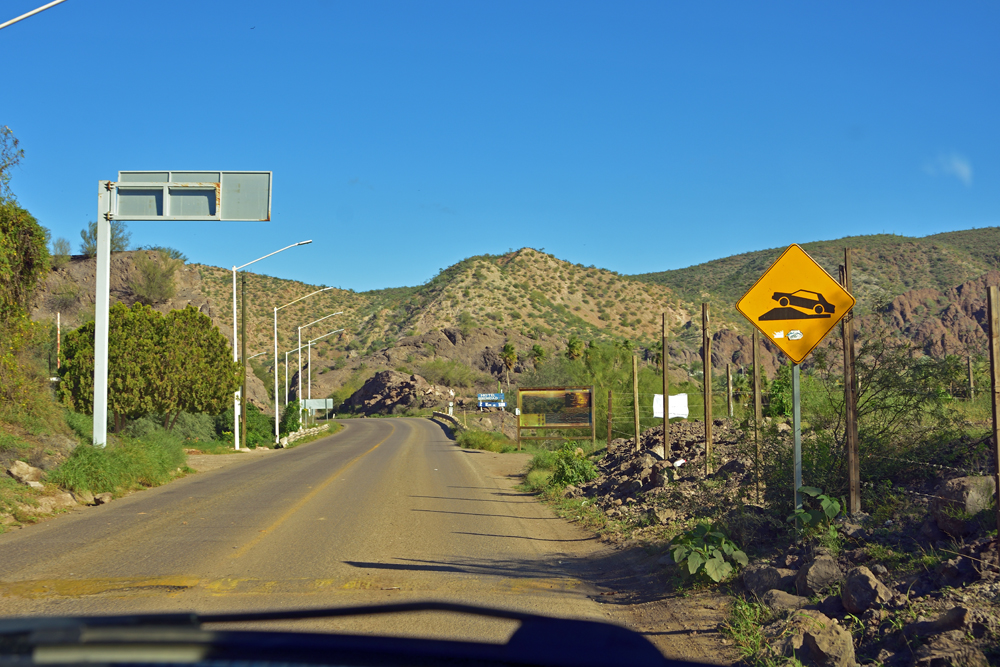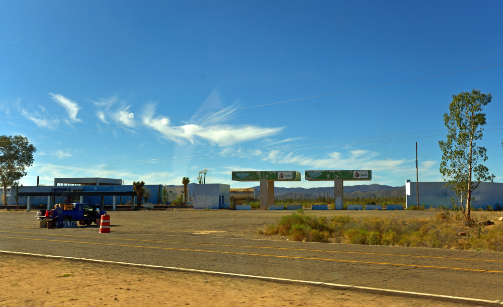 Von Coco aus geht es wieder auf der alten bzw. schon neu gebauten Route zurück auf die Hauptstrasse bis zur Abzweigung nach Bahía de los Ángeles (von hier aus auf einer Stichstrasse noch 70 km entfernt). Hier finden sich die Gebäude einer ehemaligen staatlichen Pemex-Tankstelle. Stattdessen stehen (manchmal) Pickup-Trucks mit Treibstofffässern und -kanistern für diejenigen bereit, die es versäumt haben, genug mitzunehmen.