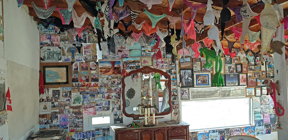 Zum Übernachten fahren wir zu Coco, einem Original, der auf der Baja eine richtiggehende Berühmtheit ist: er ist schon 82jährig, hat bei einem Arbeitsunfall zuerst eines und später durch eine Blutvergiftung das zweite Bein verloren und er lebt mitten im Nichts. Seine mit Damenunterwäsche und unzähligen Fotos dekorierte Bleibe dient als Café oder Bar und als Refugium, wo man gratis übernachten darf, wenn man bei ihm etwas konsumiert. Wir verbringen einen kurzweiligen Abend bei ihm, lauschen seinen Geschichten und dürfen uns dann auch noch in sein grosses Gästebuch eintragen. Coco’s Corner liegt in der Nähe der Strasse nach San Felipe. Diese war bisher über weite Strecken kurvig und ungeteert. Im Moment wird sie aber gerade neu gebaut und sollte nach Coco in ein bis zwei Jahren fertig sein. Dann wird sich der «Snowbird»-Verkehr möglicherweise an die Ostküste (Mexicali via San Felipe) verlagern, weil diese Strecke dann viel kürzer und besser ist.