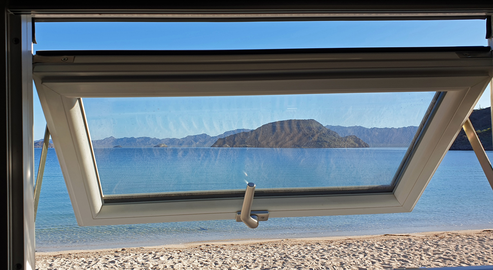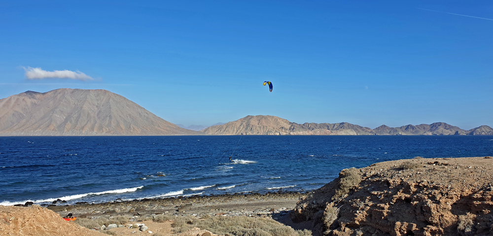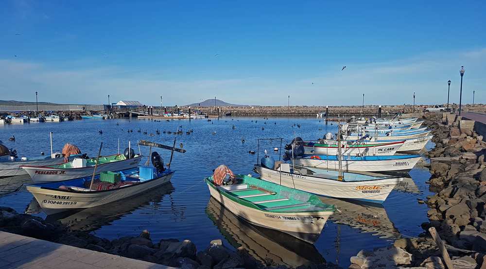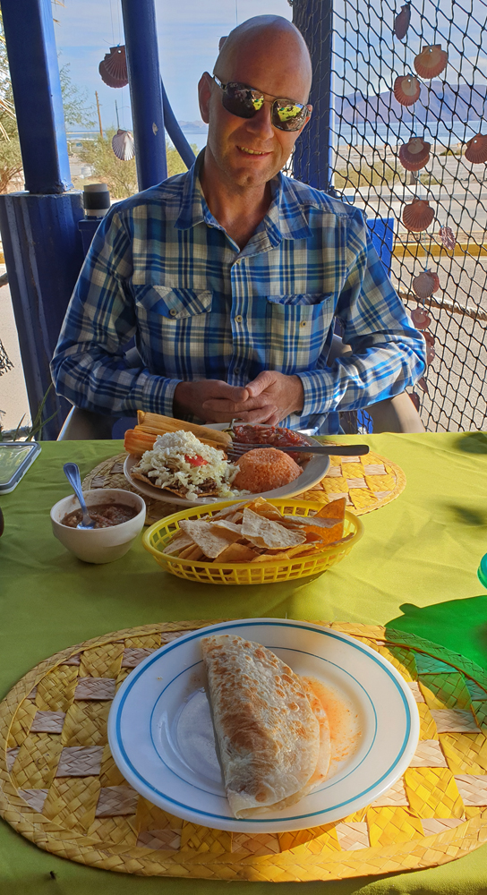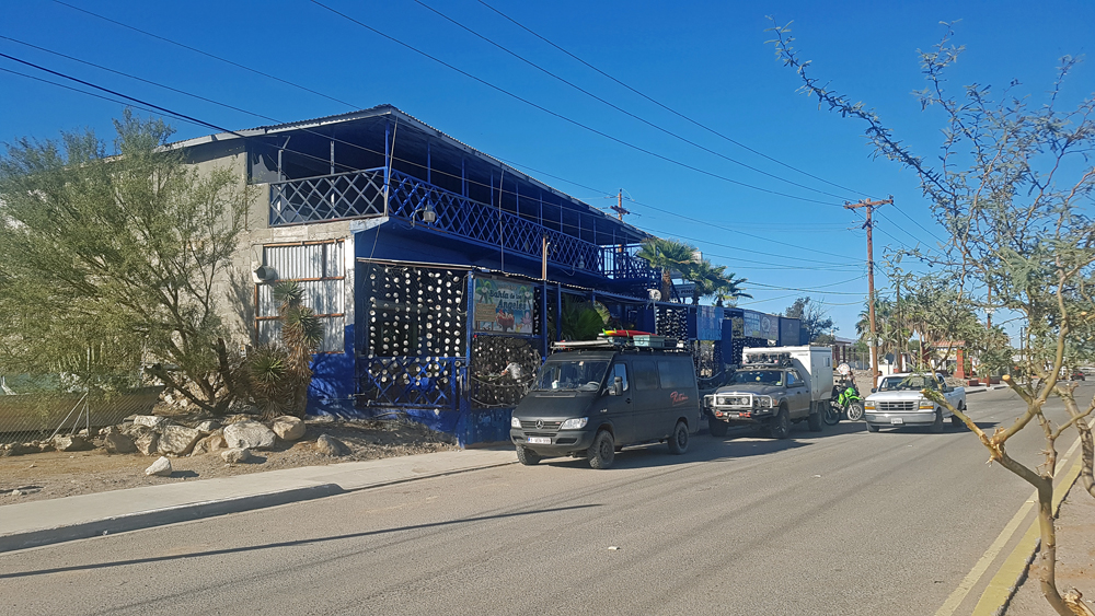 In Bahía de los Ángeles sind wir nun an der Sea of Cortez, dem langen Golf von Kalifornien angekommen. Die grosse, felsige Bucht wird durch eine Inselkette geschützt und gegen das Land hin durch eine Bergkette abgeschlossen. Durch die Thermik kommt jeweils gegen Mittag ein starker Wind auf, der erst nach Sonnenuntergang wieder einschläft. Bahía selbst ist ein kleines Nest, das mich stark an Dahab im Sinai erinnert, nur, dass es im Gegensatz dazu geradezu winzig ist (und Dahab war vor 10, 15 Jahren schon nicht gross…). Ein paar wenige Restaurants und/oder Hotels, wenige Einkaufsmöglichkeiten und entlang der Küste ein paar Resorts für Touristen. Wir sind wohl in der Zwischensaison da, denn alles macht einen sehr leeren und auch irgendwie heruntergekommenen Eindruck. Seit der Westküste hatten wir kein Telefonnetz mehr und damit auch kein Internet. Das ändert sich auch in Bahía nicht, wo wir zwischendurch das Restaurant besuchen, etwas essen oder trinken und für 30 Pesos pro Stunde pro Gerät das Internet benutzen, das wohl via Satellit zur Verfügung gestellt wird (natürlich werden genau jetzt die Nominees für EMYA 2020 bekannt gegeben…).