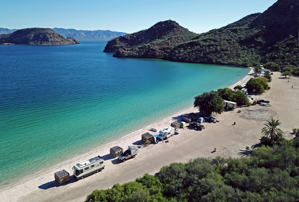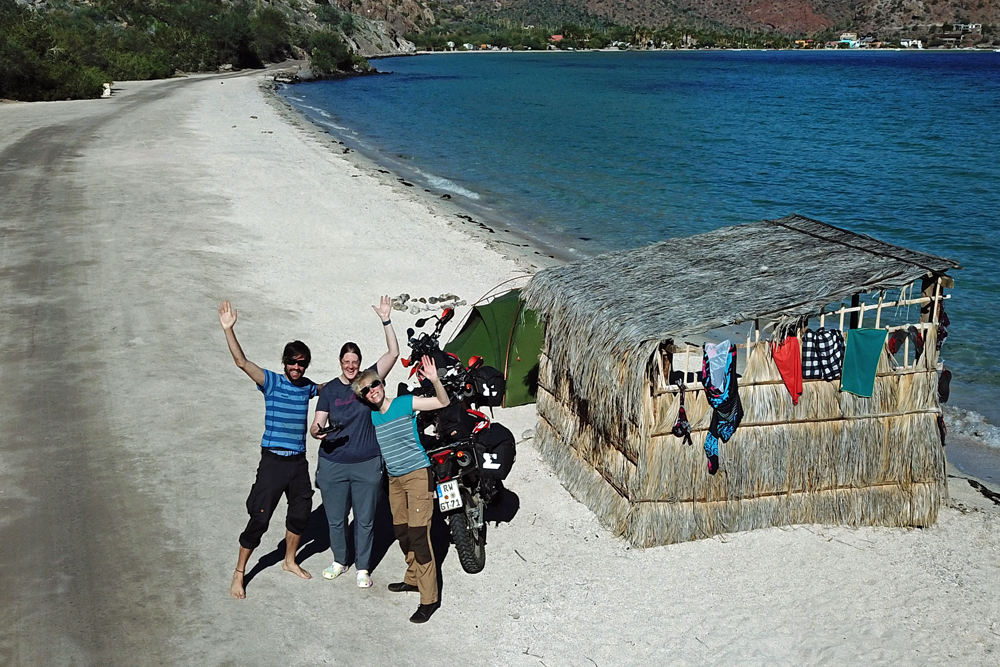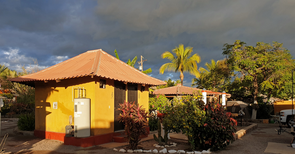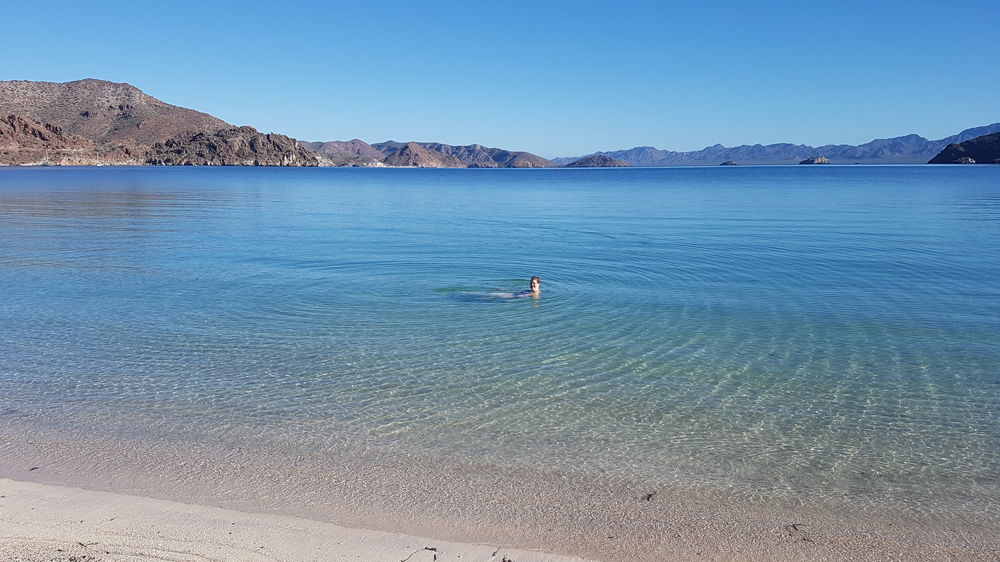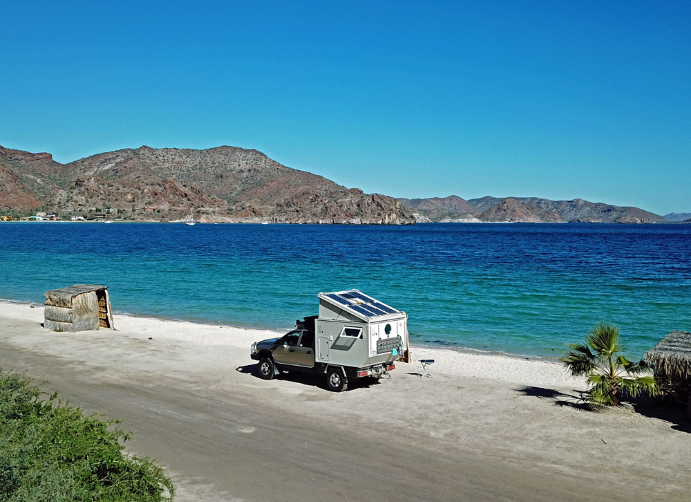 Wir entscheiden uns für die Playa El Coyote, wo wir einige Tage direkt am Meer bleiben und das Wasser sogar warm genug ist zum Schwimmen! Es gibt hier nur Plumpsklos, aber sie werden – wie die ganze Bucht – sauber gehalten und gepflegt. Dafür kostet das Stehen hier auch 200 Pesos. Es gibt hier keine Restaurants oder Läden, aber weg muss man trotzdem nicht, da von Tag zu Tag verschiedene Händler zu Fuss oder mit dem Auto vorbeikommen. Mal gibt es Gemüse, dann wieder Camarones (Garnelen) oder Fisch, dann kommt wieder jemand mit einem Stapel Quarkkuchen vorbei, die seine Frau frisch gebacken hat. Einer hat auf seinem Pickup einen grossen Wassertank, der andere kommt mit Kayaks zum mieten vorbei. Und sogar ein Propan-Lastwägelchen findet den Weg bis in die Bucht und füllt den Langzeit-Campern (viele aus West-Kanada oder Oregon) die Tanks auf.