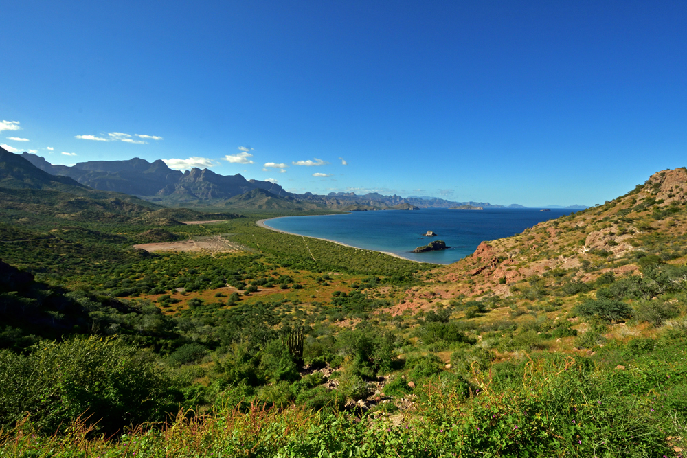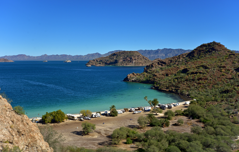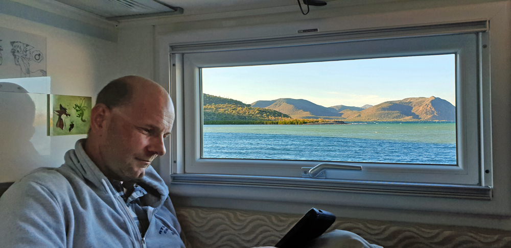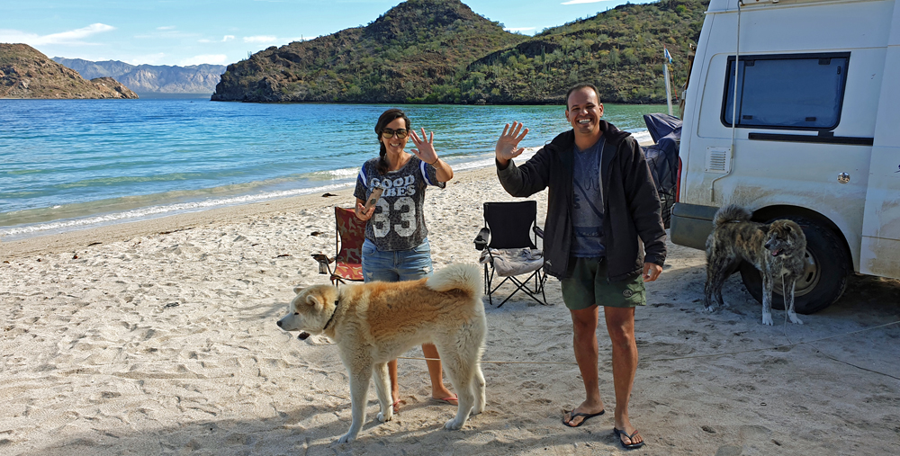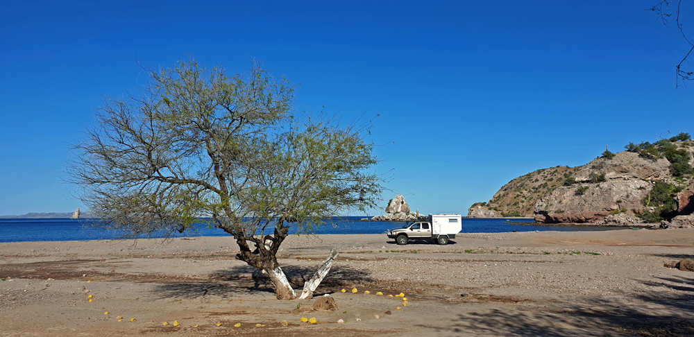 Am Morgen verabschieden wir uns endgültig von Sandra und Reto und Diego, die nun wieder Richtung Süden fahren. Nachdem ich einen Ausflug auf die kleine Insel gemacht und ein paar „Poser Pics“ von unserem Gefährt geschossen habe, geht es weiter entlang der wunderschönen Bahía de Concepción. Von oben sehen wir wieder die Playa El Coyote, an der wir zunächst vorbeifahren. Wenig später müssen wir einfach umdrehen, um wieder zwei Nächte dort zu verbringen, weil es einfach ein sooooo schöner Ort ist! (Hier kostet die Übernachtung übrigens 200 Pesos, ebenfalls nur für Plumpsklos. Aber im Gegensatz zu El Requeson sind hier Strand und Plumpsklos äusserst gepflegt und man hat das Gefühl, dass sich die Leute – auch die vielen „Snowbirds“, die teils schon seit über 30 Jahren jeweils mehrere Wintermonate hier verbringen – um den Ort kümmern).