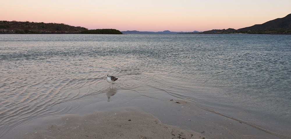 Die Playa El Requeson, wie die Sandbank offiziell heisst, sieht sehr malerisch aus. Sie bildet bei Ebbe eine Verbindung zur kleinen Isla Requeson, die man zu Fuss erkunden kann. Als Stellplatz ist der Ort aber leider nicht zu empfehlen. Die Übernachtung kostet zwar „nur“ 150 Pesos (umgerechnet CHF 7.50), aber das ist eindeutig zu viel für einen schmutzigen Strand, ungeleerte Abfalleimer, die von zahllosen Möwen geplündert werden, und Plumpsklos, die man nicht mal von aussen ansehen möchte (um den Preis in Relation zu setzen: für 4 Pesos bekommt man im Laden bereits ein Brot und der superschöne RV Park in Loreto mit heissen Duschen und sauberen WCs hat nur 180 Pesos gekostet).