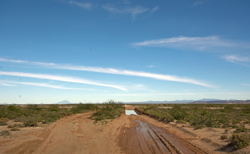 Von San Ignacio fahren wir die 65 km zur Laguna San Ignacio, einer der drei Orte, wo die Grauwalmütter ihre Jungen aufziehen. Nur leider etwas später im Januar, wie es scheint… Allerdings schaffen wir es gar nicht erst, zu den beiden Camps direkt an der Lagune, wo man übernachten könnte und von wo aus auch Bootstouren angeboten werden, weil alle Strassen dorthin überschwemmt sind… Man hätte sich natürlich auch im Ort selbst über die Verhältnisse erkundigen können… Aber dann wären wir ja vielleicht gar nicht dorthin gefahren und hätten eine tolle Gegend verpasst!