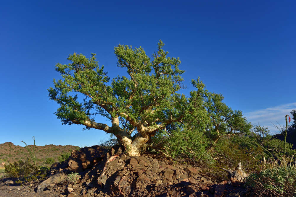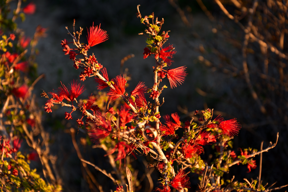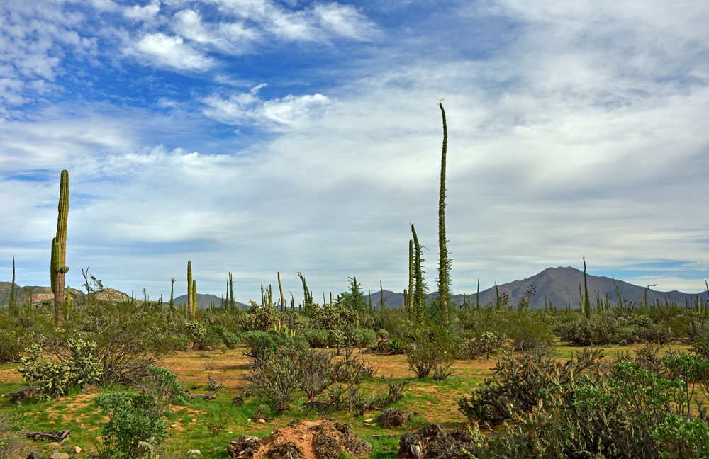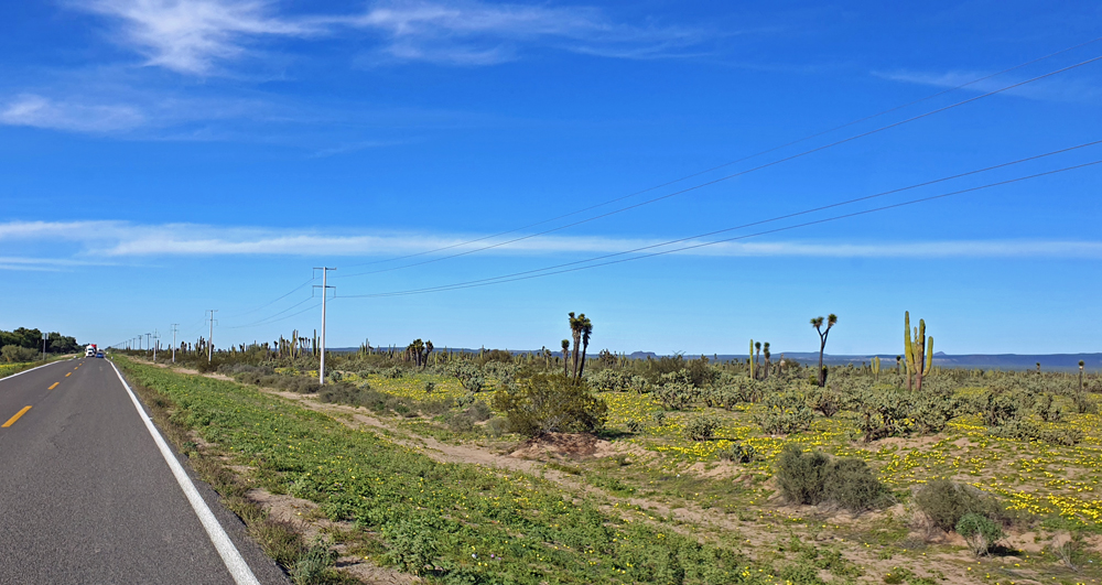 Von den Regenfällen über die Feiertage zeugen übrigens nicht nur die überschwemmten Strassen entlang der Lagune, sondern auch die Vegetation: Wo es vorher – abgesehen von einigen Kakteen, Sukkulenten und widerstandsfähigen Büschen – praktisch kahl und unbewachsen war, ist jetzt alles mit einem grünen Schleier überzogen. Die Cirios haben auf einmal rundum kleine belaubte Ästchen und die Büsche und Pflanzen am Strassenrand beginnen zu blühen!