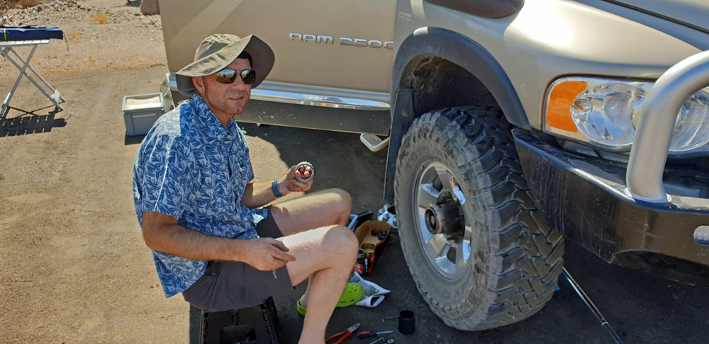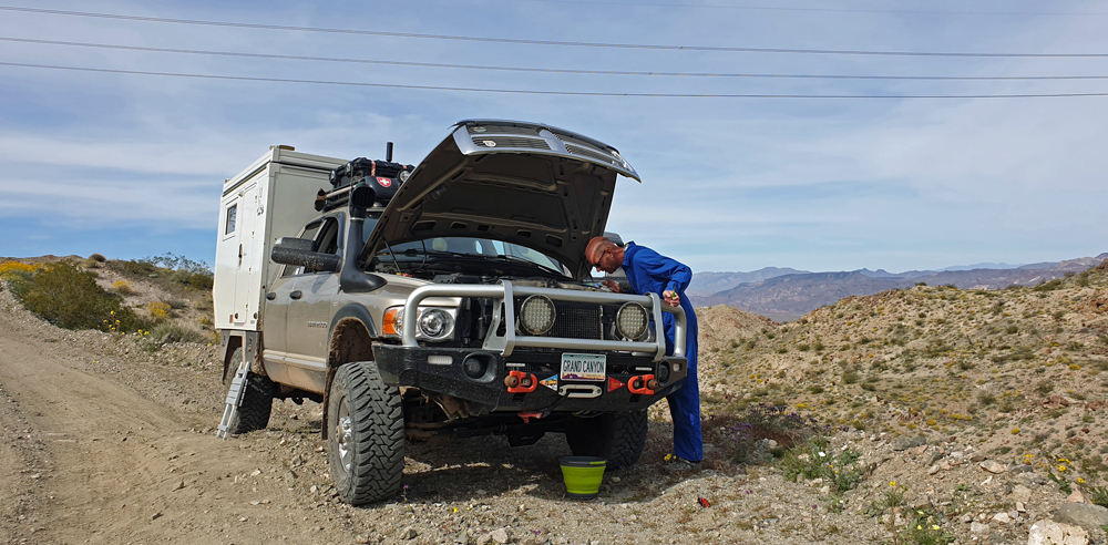 Ozy repariert die Schnorchelhalterung Herd-Ersatz… Wo leckt die doofe Pumpe?! Ouuu – Kederschiene fürs Tarp abgerissen Franz bei der Reifenreparatur Ozy am Service – irgendwo im Nirgendwo Auspuffkrümmer-Wechseln auf dem Campground Ozy hilft auch gern bei Fremd-Autos… Kleiner Unterhalt in Ensenada Hier hat sich die Lüfterkupplung verabschiedet… Servolenkungsschlauch-Reparatur mitten auf der Strecke Die neuen Kegelräder fürs vordere und hintere Differential Auch Polieren gehört zum Unterhalt…