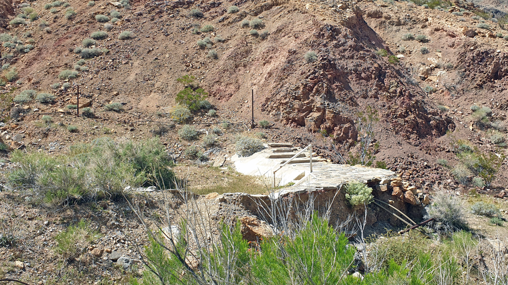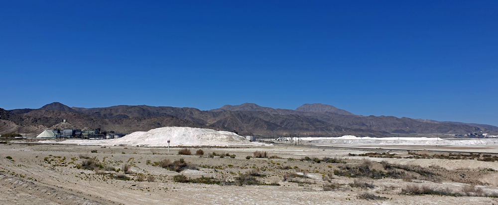 Im Tal unten wird es allmählich etwas warm. Nachdem wir einen Ausflug zum Telefonieren gemacht haben (wir haben weder im Panamint noch im Searles Valley Empfang, weshalb wir eine Dreiviertelstunde bis fast nach Ridgecrest fahren müssen), ziehen wir mit unseren Freunden zur ehemaligen «Onyx Mine» auf der anderen Talseite um. Es handelt sich dabei um einen von 1958 bis in die 70er Jahre betriebenen Steinbruch für den dekorativen Onyxmarmor (der weder mit Onyx noch mit Marmor etwas zu tun hat; wir waren diesem Gestein schon auf der Baja California in El Marmol begegnet). Der Rohstoff wurde vor Ort verarbeitet und wir können uns auf die ebenen Betonfundamente stellen, die gleichzeitig einen wunderbaren Blick über das Panamint Valley bieten.