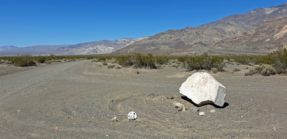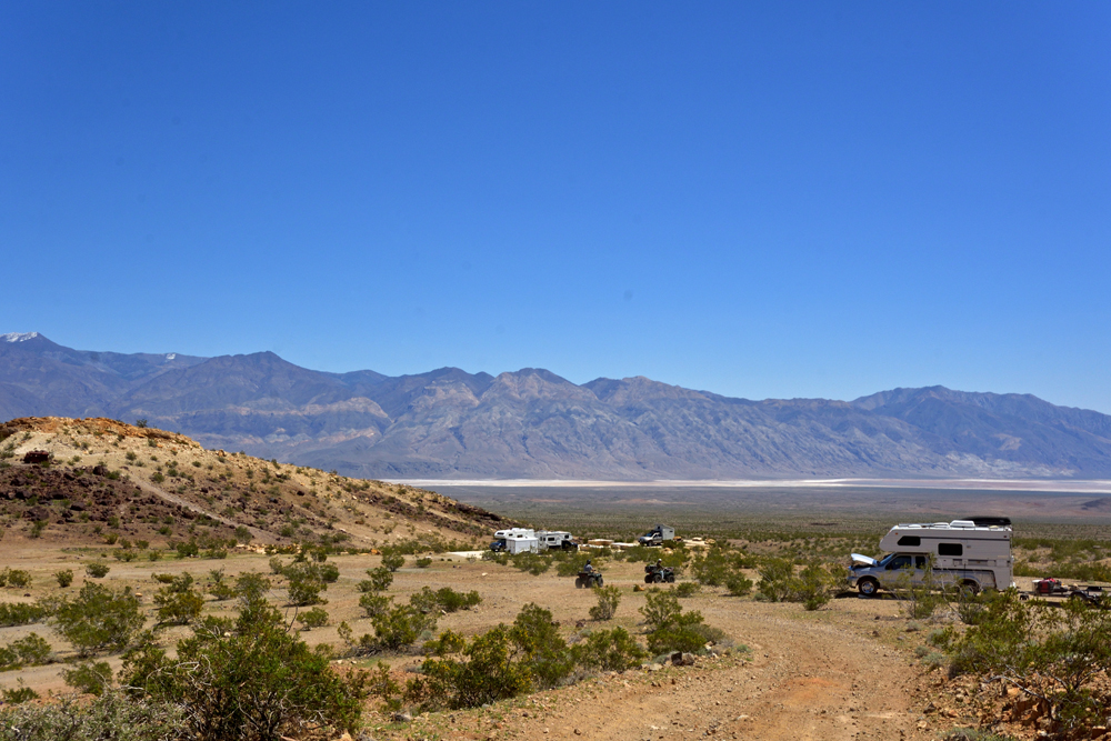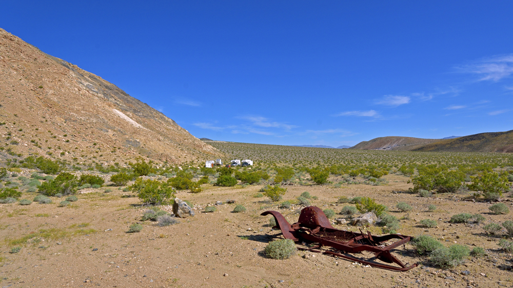 Endlich ist der 15. April da und wir fahren wieder durch den Poison Canyon und vorbei an Trona im Searles Valley. Dieses Mal haben wir Zeit, die Infotafeln zu lesen, und erfahren, dass das Becken des ausgetrockneten Searles Lake eine vielzahl von Mineralien enthält, die – beginnend mit Borax – seit 1873 gewonnen werden. Auf dem Trona Pass geniessen wir den schönen Blick aufs Panamint Valley und fahren dann im Tal unten auf der etwas erhöhten Erdpiste nach Ballarat auf der anderen Seite des Panamint-Salzsees. Don und seine Freunde haben ihr Camp an der Strasse zum Surprise Canyon aufgeschlagen und den Weg dorthin extra für uns beschildert!