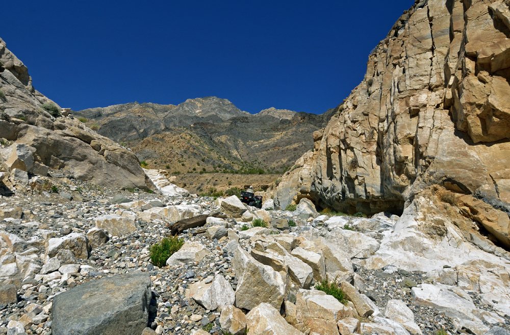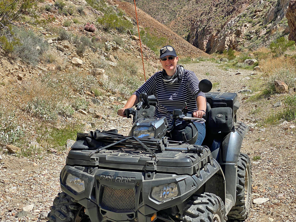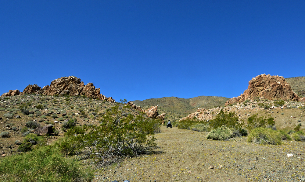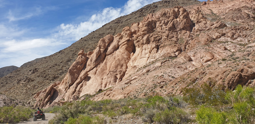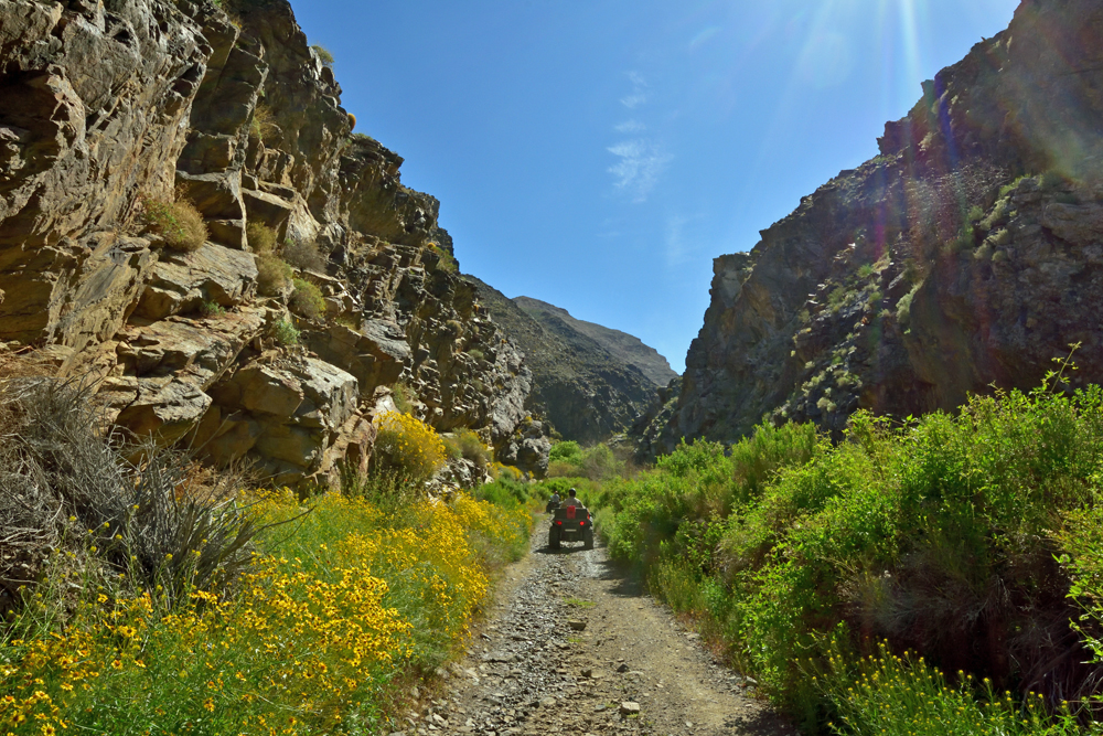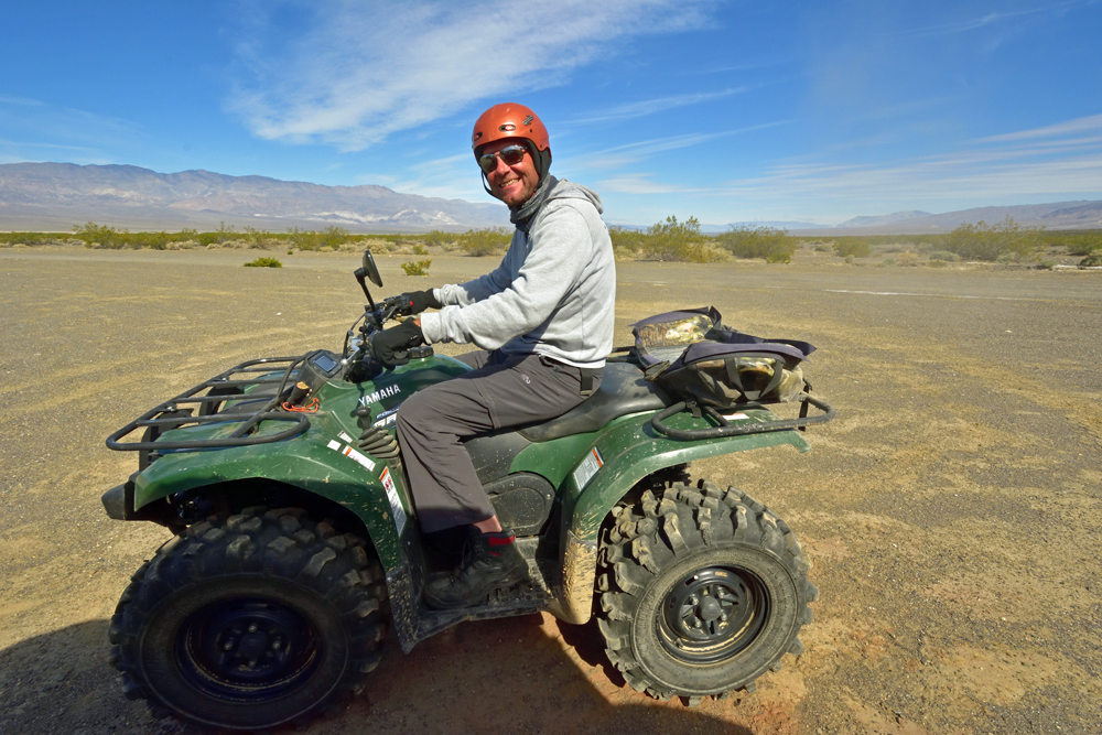 Die folgenden 6 Tage lassen wir unsere Camper stehen und erkunden die angrenzenden Canyons mit ATVs. Don war so lieb und hat extra für Ozy ein zweites  mitgebracht! Der freut sich wie ein kleiner Junge und klettert bald ebenso geschickt über die zu einem grossen Teil in ausgetrockneten Flussbetten verlaufenden, steinigen Pisten wie Don und Bob.