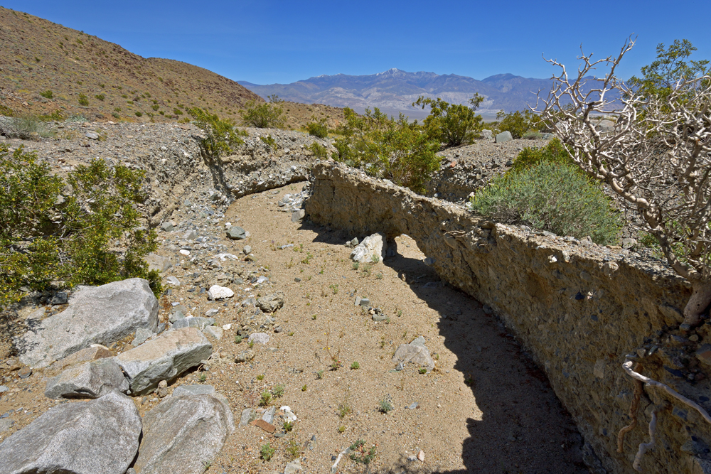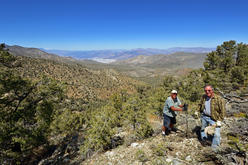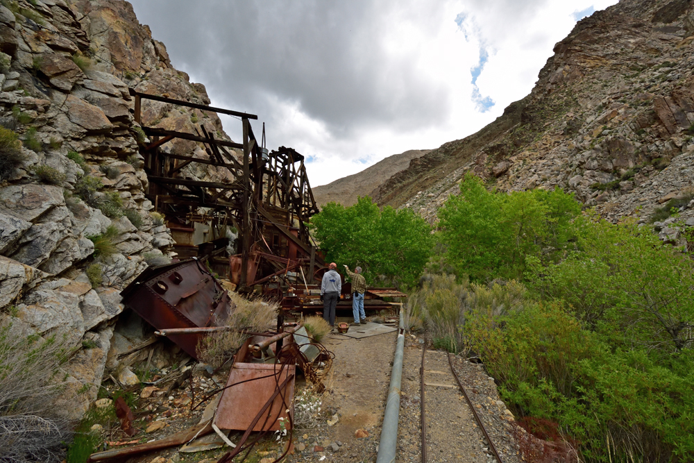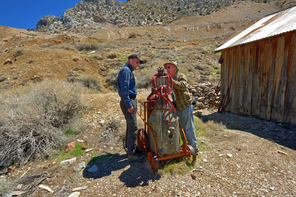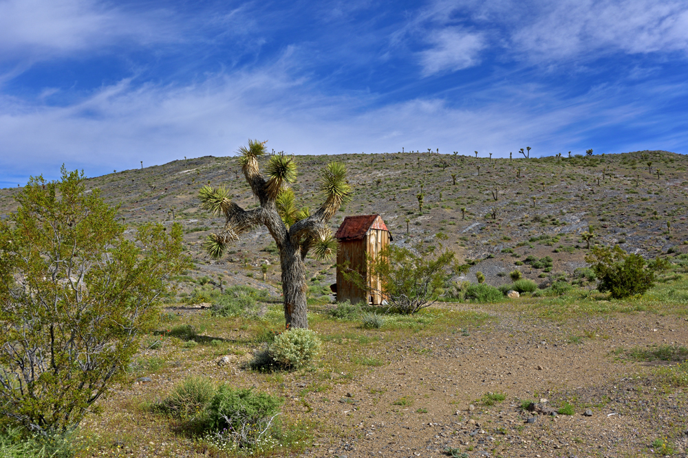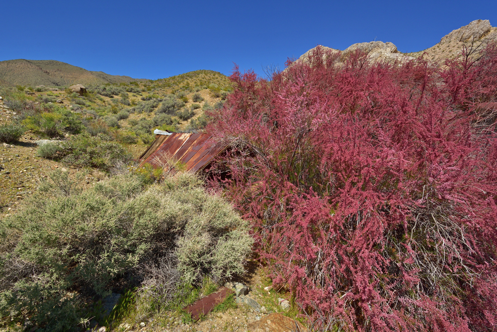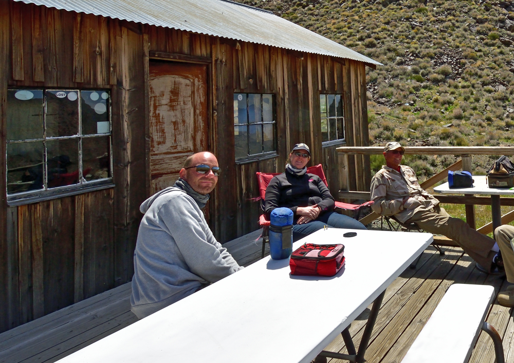 Mit Gino waren wir vor fast genau eineinhalb Monaten hier und fanden das Panamint Valley ziemlich trostlos. Dank Don, Bill und Bob erschliesst sich uns die Gegend nun völlig neu. Sie verbringen teils seit 30 Jahren regelmässig Zeit hier und kennen dadurch die Umgebung wie ihre Westentasche. Sie freuen sich, uns alles zu zeigen und erzählen uns viele spannende Geschichten und Hintergründe. Sie nehmen uns mit in versteckte, farbige Canyons, die uns manchmal auch mit Quellen und reichhaltiger Vegetation überraschen, und auf hohe nadelbaumbestandene Pässe, von denen man wunderschöne Ausblicke in angrenzende Täler und bis ins Death Valley hat. Sie führen uns zu zahlreichen Überresten alter Minen, zur leider mittlerweile abgebrannten Barker Ranch, wo die „Manson-Family“ festgenommen wurde, und zu versteckte Hütten, die man frei nutzen könnte (sog. «Adopt-a-Cabin», die meistens von regionalen Clubs teils zusammen mit dem Nationalparkservice erbaut und gepflegt werden und alle sehr individuell gestaltet und eingerichtet sind).