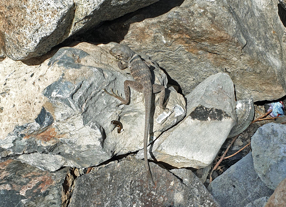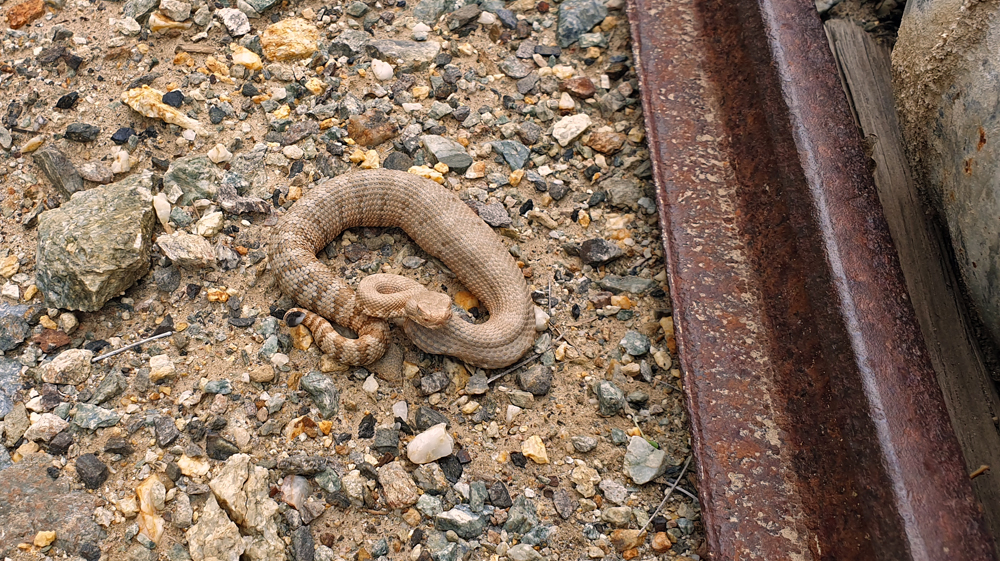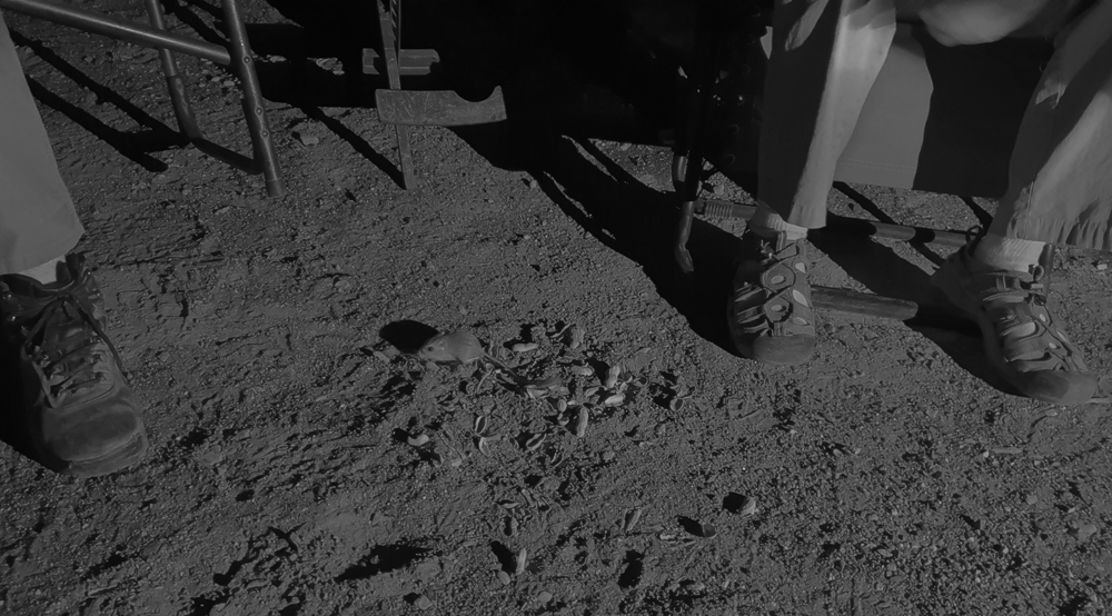 In der Nacht hören wir Burros, die wir am Tag auch manchmal zu Gesicht bekommen, wir entdecken eine vollgefressene Baby-Klapperschlange und erhalten Besuch von zwei gar nicht scheuen Taschenspringern, die zwischen unseren Füssen herumwuseln.
