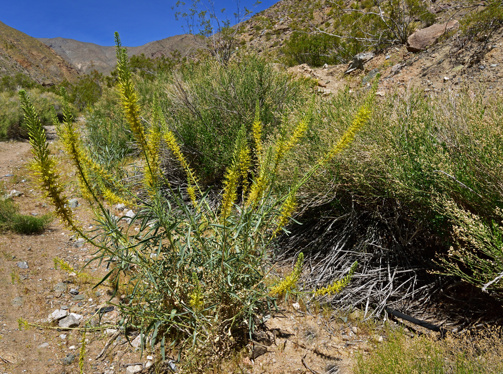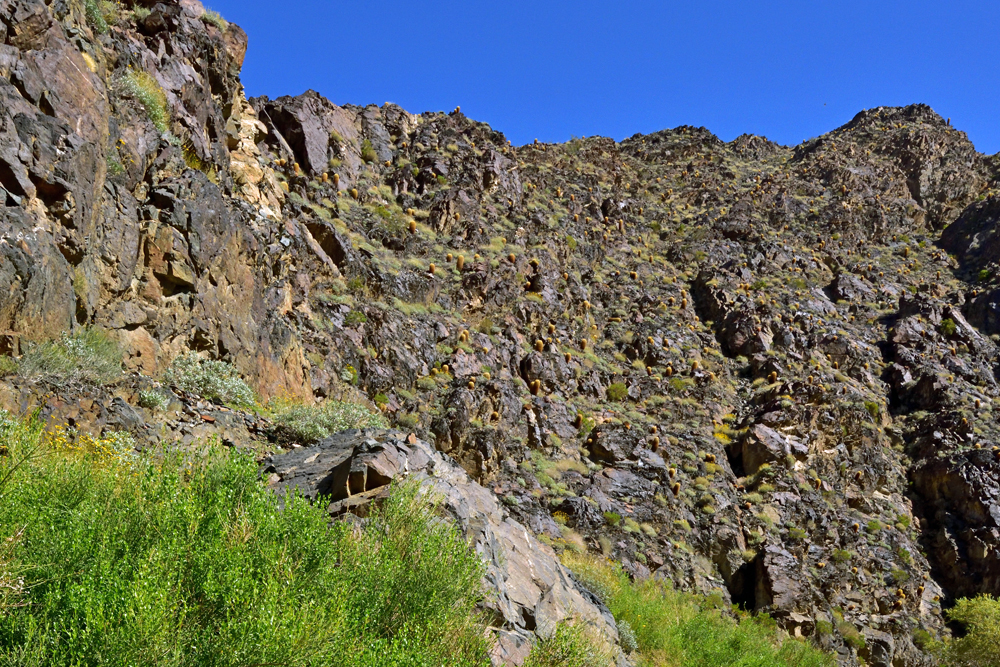 Im Gegensatz zu den anderen Gegenden, die wir während der letzten Wochen besucht haben, zeigt das Panamint Valley – obwohl die Salzseen recht viel Wasser führen – kaum Anzeichen eines Wüstenfrühlings. Dafür warten die Seitentäler und Canyons mit leuchtend gelb blühenden Brittlebush und zahlreichen Blumen auf und wir staunen über die Kakteen, die sich hoch oben in den Felswänden ein Plätzchen in Rissen und Spalten erobert haben.
