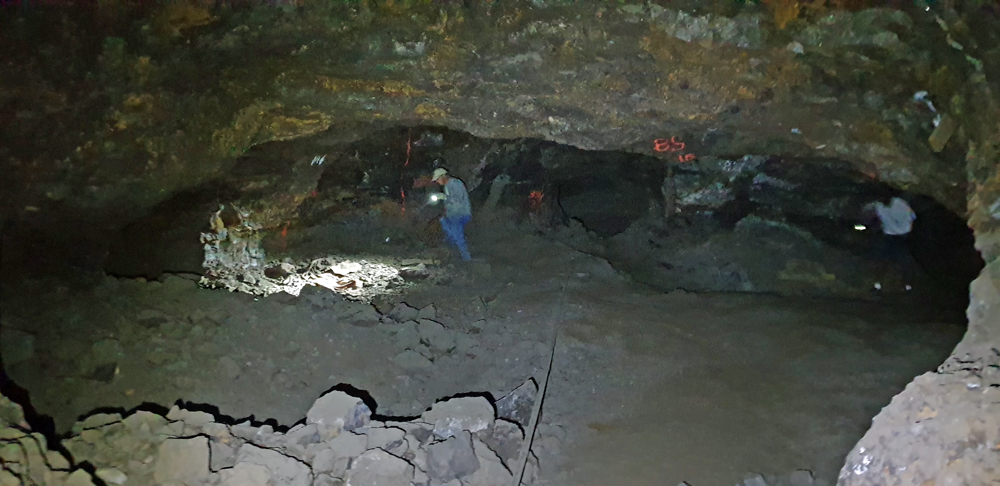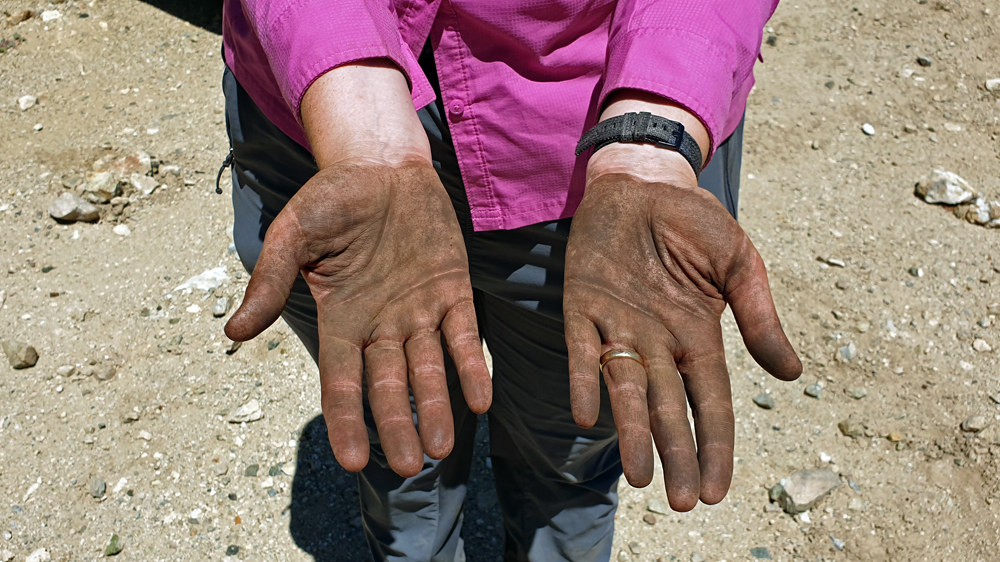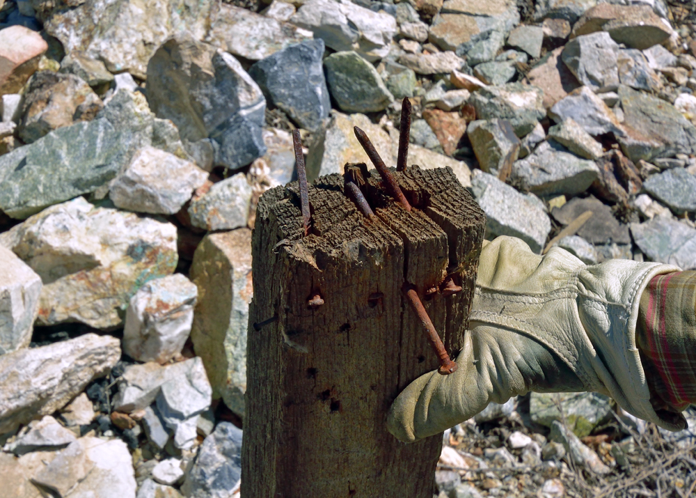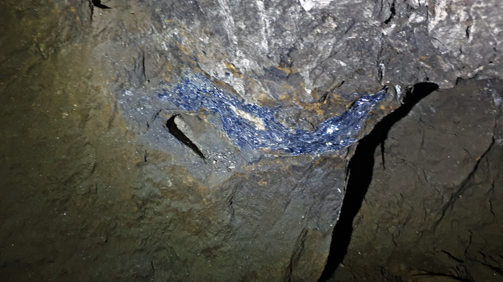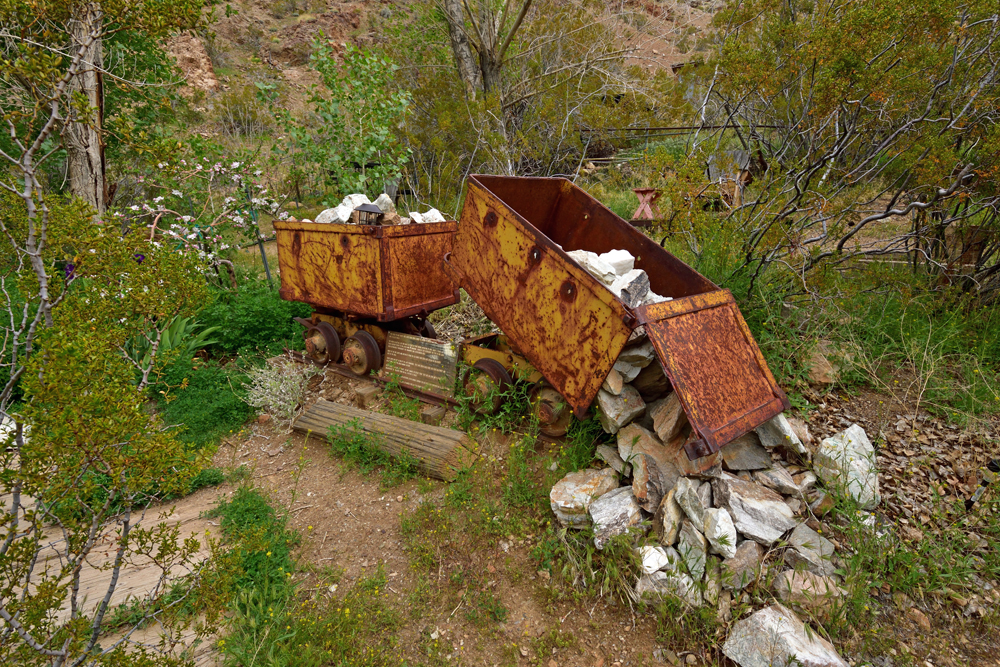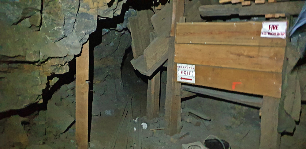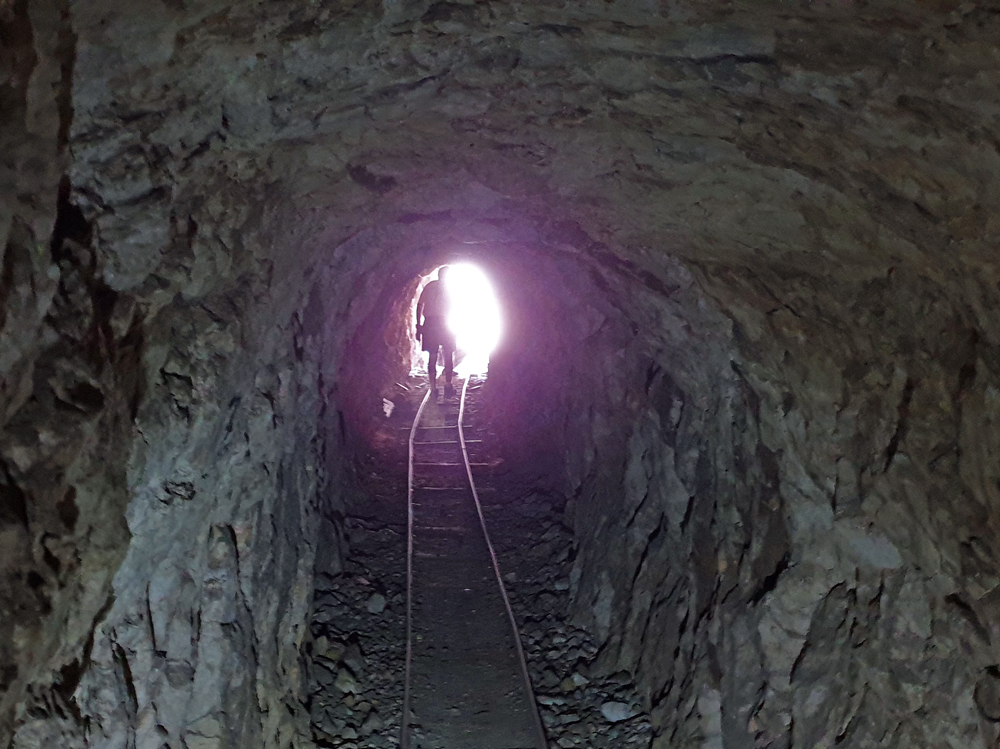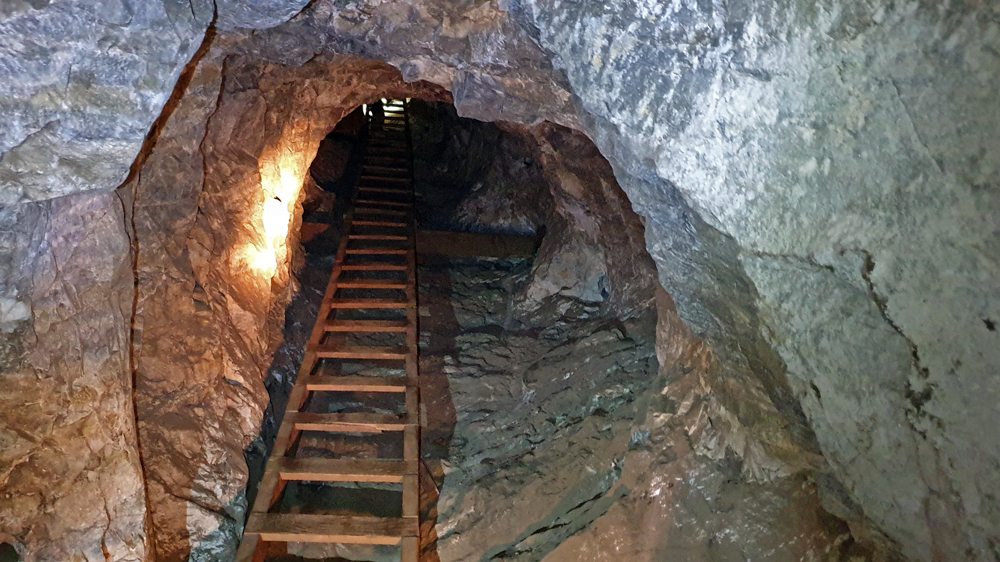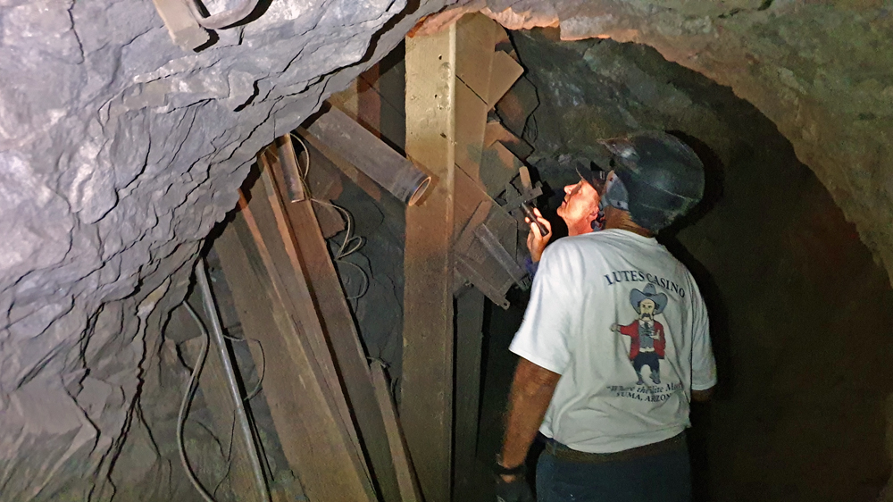 In den folgenden Tagen besichtigen wir weitere Minen und Cabins in der Umgebung. Ein Highlight ist sicher der Besuch der ehemaligen Defense Mine (Pb-Ag-Au-Zn-Cu), die wir auch von Innen besichtigen. Wir sehen alte Gleise, Kartons, die ehemals Sprengstoff enthielten, ein grob gewobenes Hemd und blauschimmernde Mineralien. Und auch hier hat es überall Markierungen in Leuchtorange… Wir erklettern bei unseren Erkundungen zahlreiche lange Holzleitern und gelangen schliesslich zu einem zweiten Ausgang. Ein Blick auf den steilen Geröllhang unter uns lässt uns dann aber wieder den gleichen Rückweg im Innern des Berges nehmen…