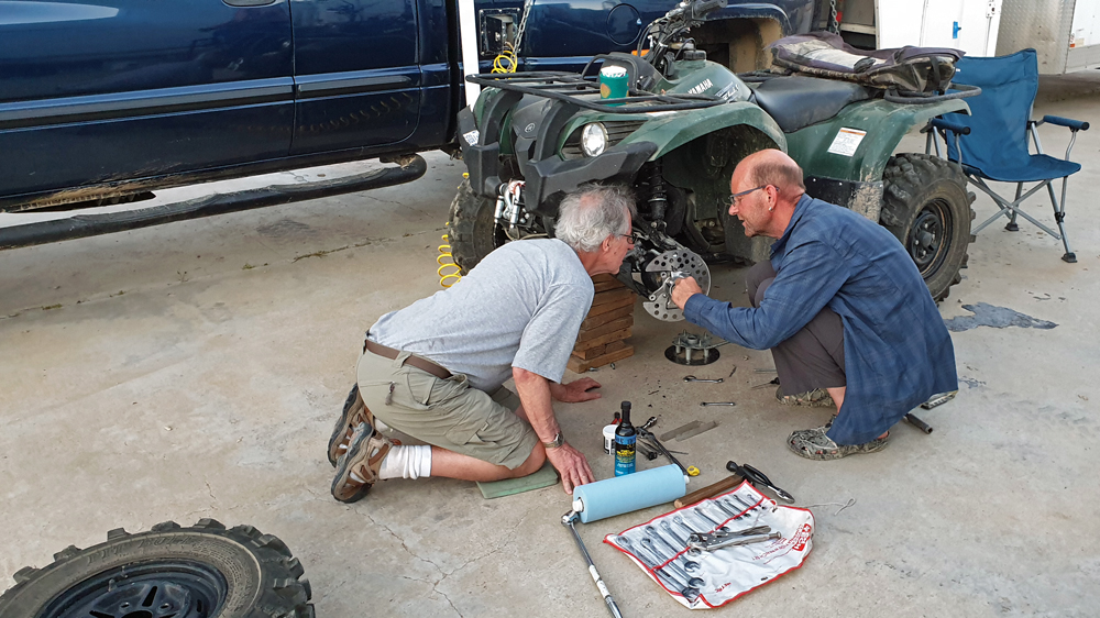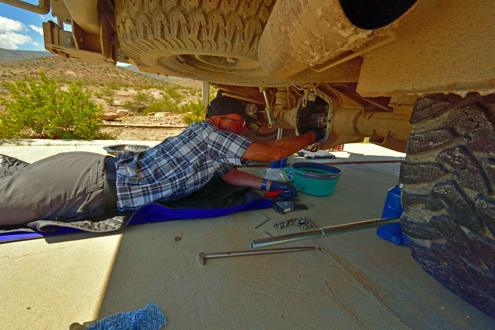 Die glatte, feste Unterlage bietet Ozy zudem die Gelegenheit, den nach der Anpassung der Achsübersetzung nach 500 Meilen fälligen Ölwechsel im hinteren Differential auszuführen sowie die Bremsen zu überholen.
