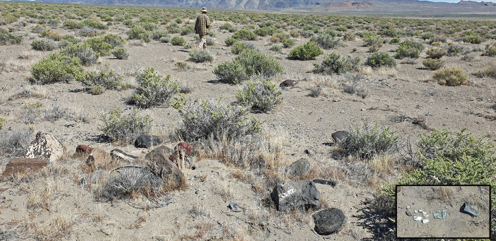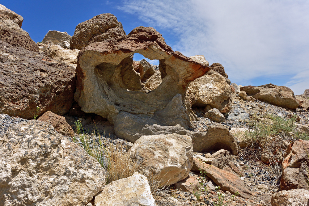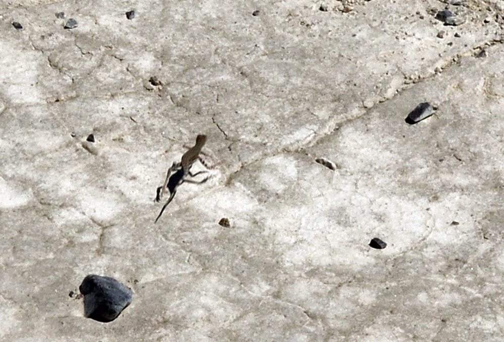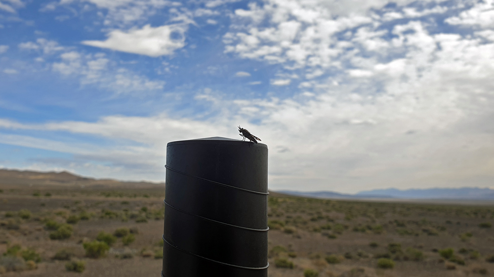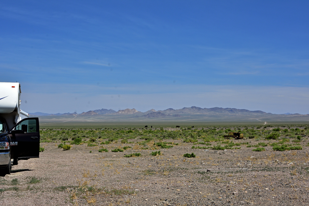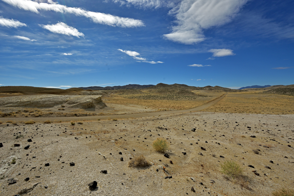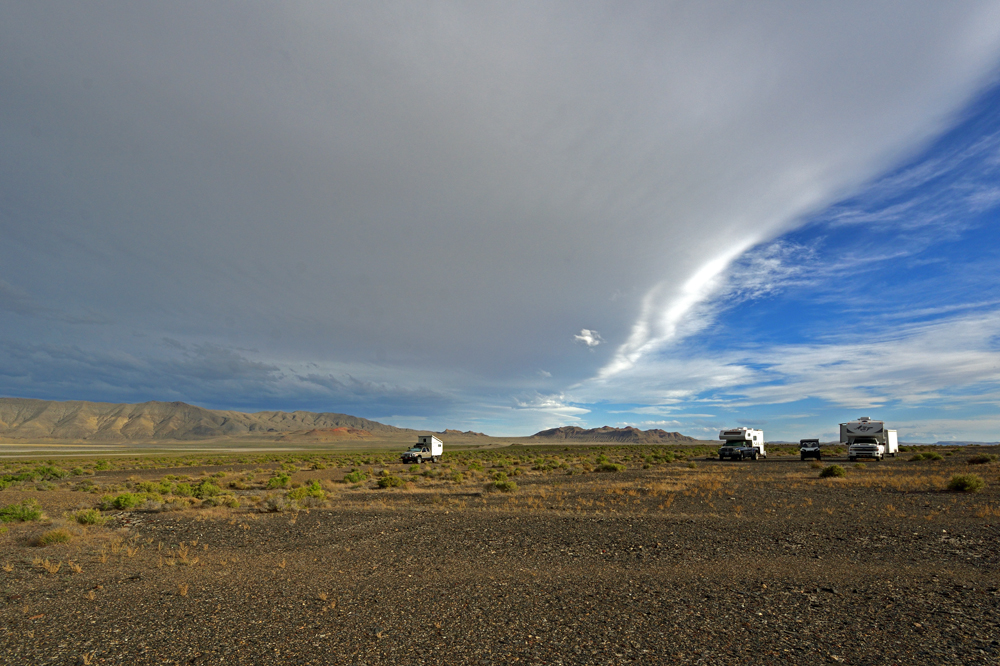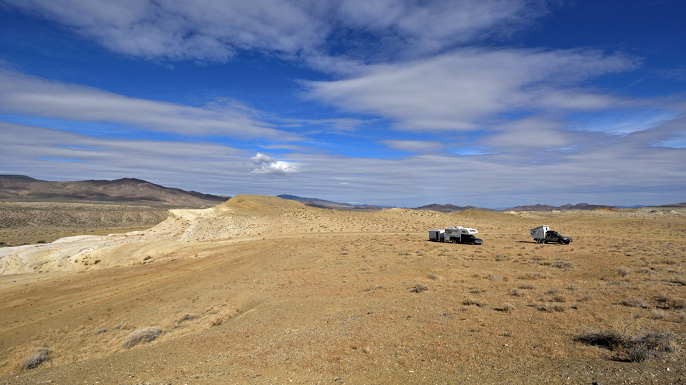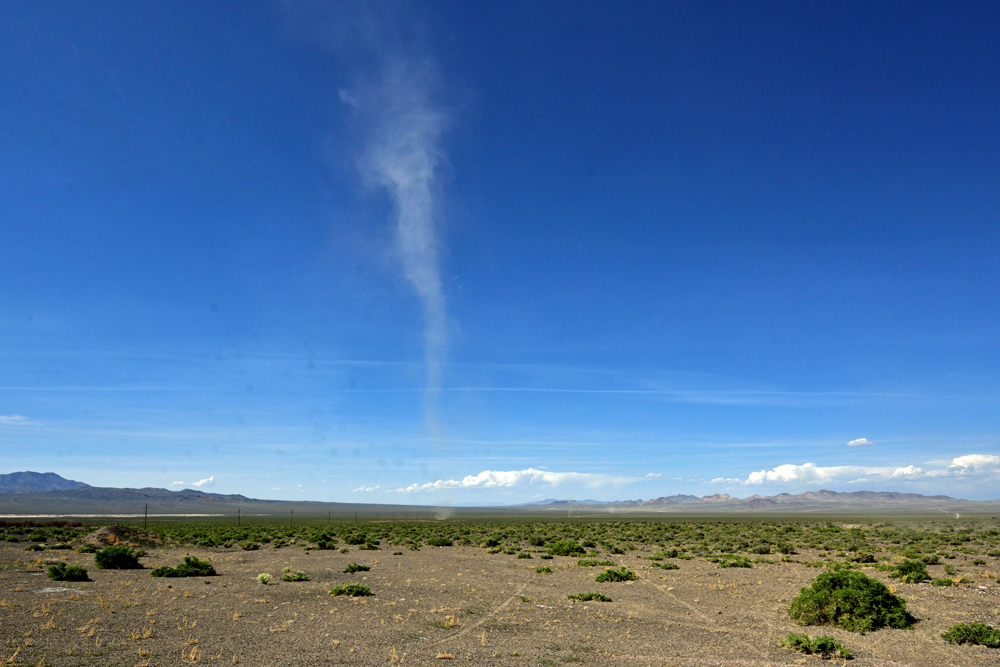 Unser Camp schlagen wir nun für ein paar Tage bei den Crow Springs am Rand des Big Smoky Valley auf. Obwohl es viele vulkanische Überreste – und andere interessante geologische Formationen – hat, kommt dessen Name nicht davon, sondern vom Dunst, den der vom Wind aufgewirbelte Sand hinterlässt. Wir können während unseres Aufenthalts denn auch immer wieder grössere und kleinere «Dust Devils» beobachten.