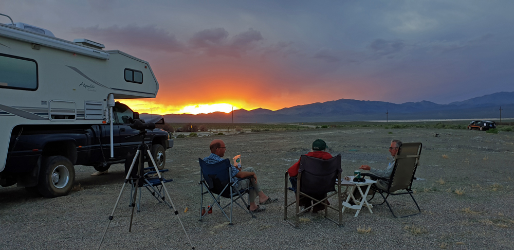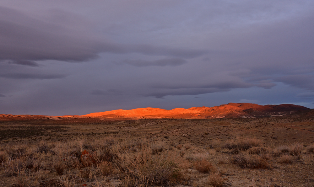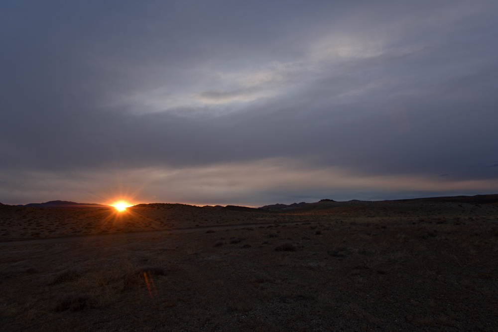 Unser Platz bei den Alkali Hot Springs ist trotz allem relativ ruhig und hat gutes Internet (da nicht zu weit von der US-95 entfernt), weshalb wir drei Tage hierbleiben. Langweilig wird es nieg grössere und kleinere Burroherden und einige Wildpferde ziehen vorbei, Dust Devils rauschen über die Ebene und Autos auf der benachbarten Erdstrasse lassen lange Staubfahnen hinter sich stehen. Wir bewundern einen herrlichen Vollmond und geniessen wunderschöne Sonnenuntergänge.
