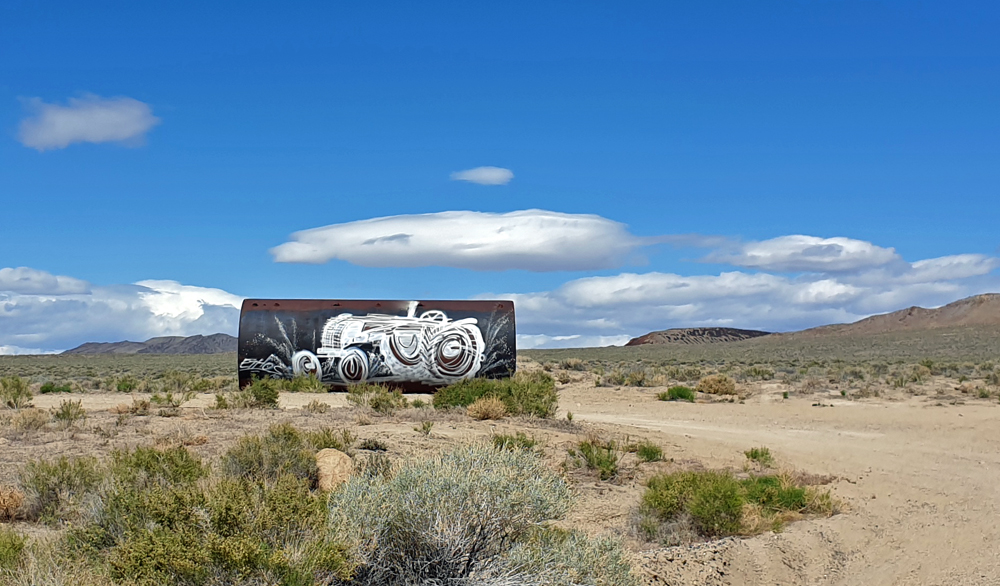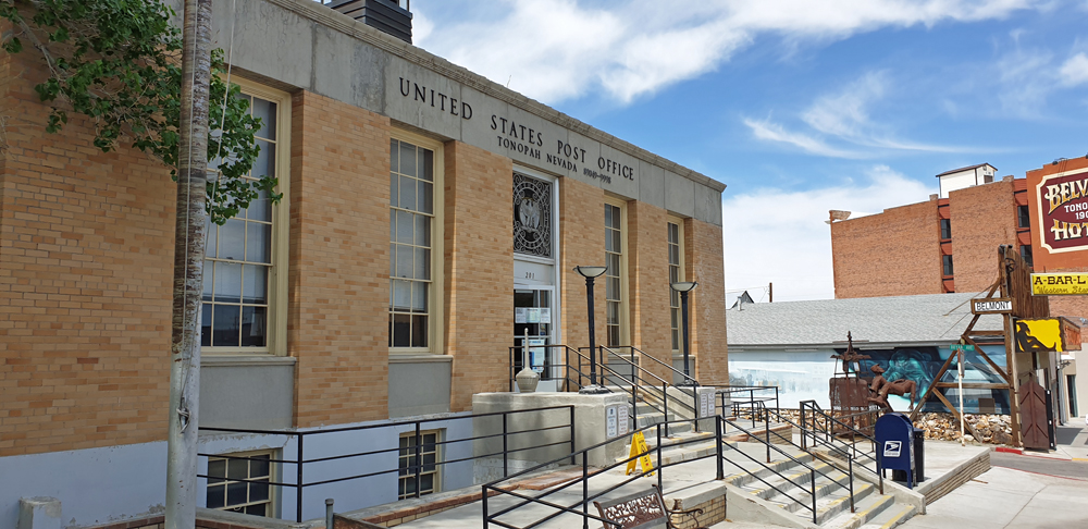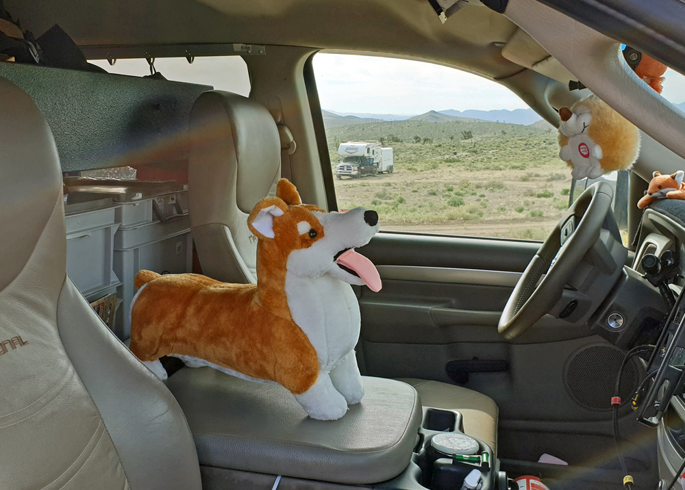 Am nächsten Tag fahren wir nach Tonopah, um Wasser aufzufüllen und Ozys Mutter einen lebensgrossen Plüsch-Corgi zu senden, den wir in Beatty für sie gefunden hatten (wir würden ihn ja am liebsten selbst behalten, aber er ist leider doch ein bisschen zu gross…). Nachdem wir beim benachbarten Kleidergeschäft einen passenden Karton erhalten haben, verläuft der Versand im aussen schön renovierten Postgebäude recht problemlos.