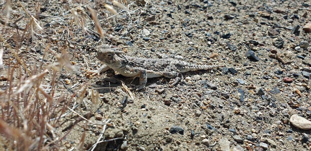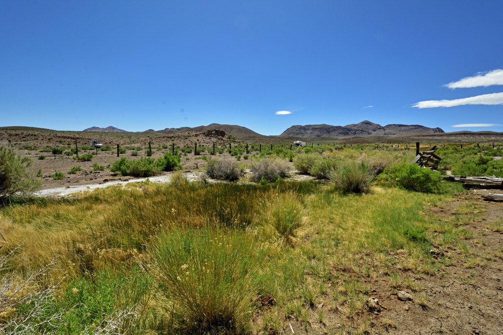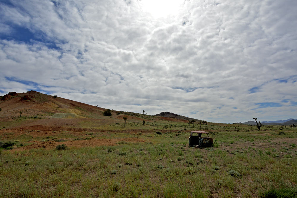Zum Glück kennen die beiden die Gegend und ihre Besitzer gut und finden uns einen anderen Platz nördlich von Beatty. Dieser liegt ebenfalls in einer Minengegend, der ebenfalls kürzliche Aktivität anzusehen ist, doch ist im Moment dort nichts los und wir können es uns «auf der grünen Wiese» gemütlich machen. Dachten wir jedenfalls, denn das hübsche, grüne «Gras» ist überaus stachelig und anhänglich… Oh, well. Für eine Nacht geht es grad so.