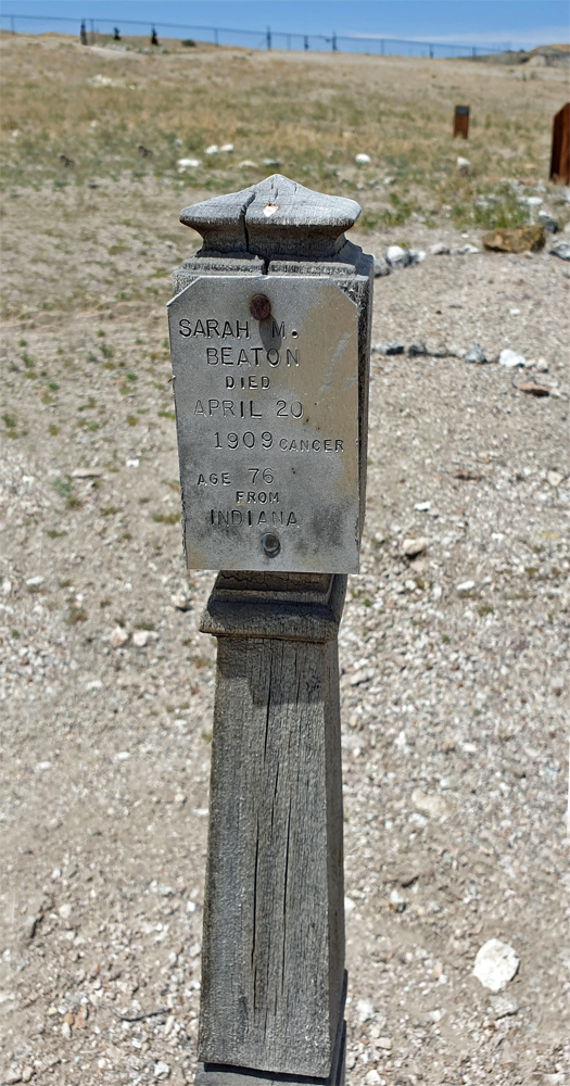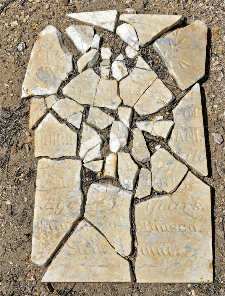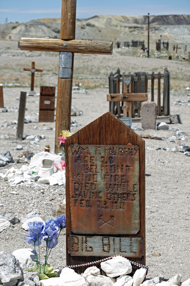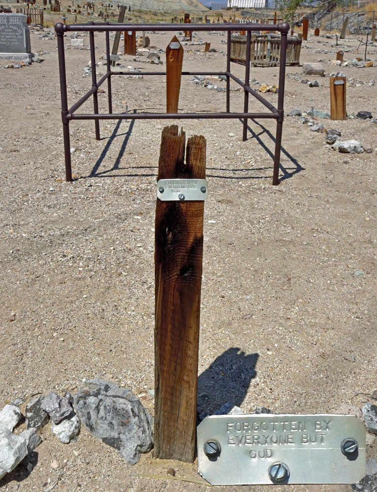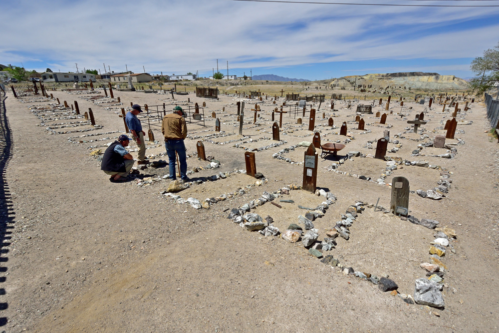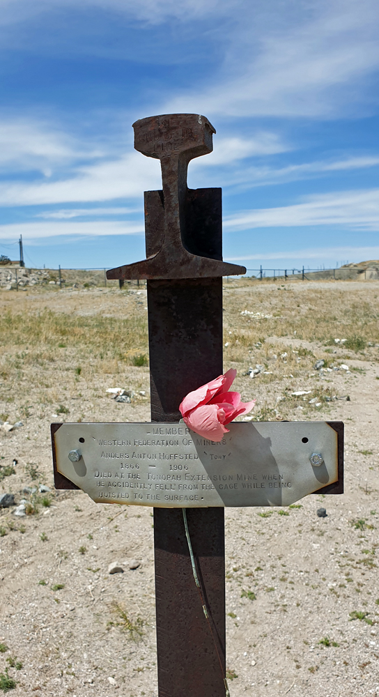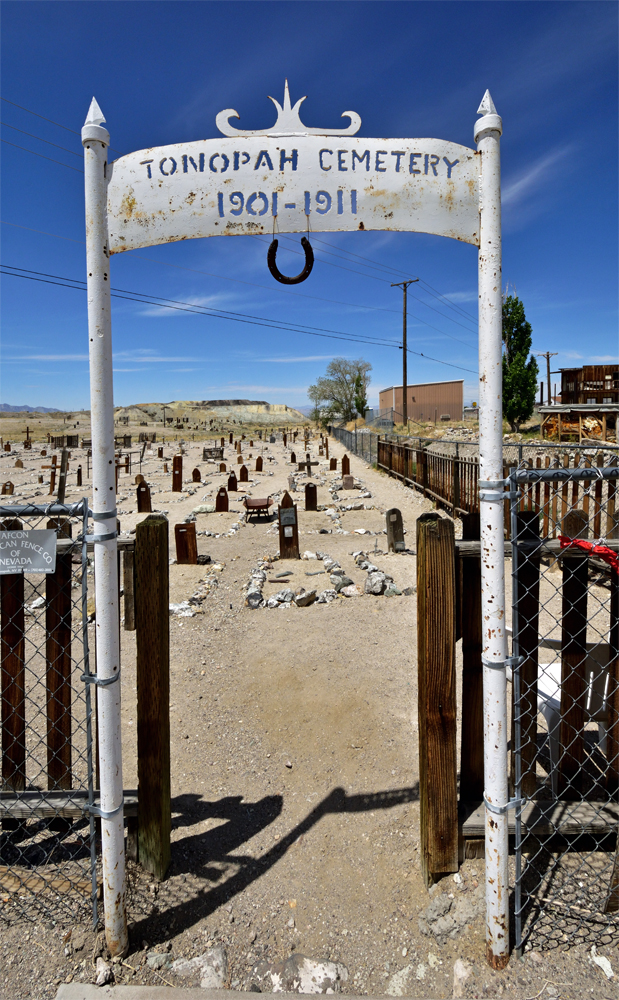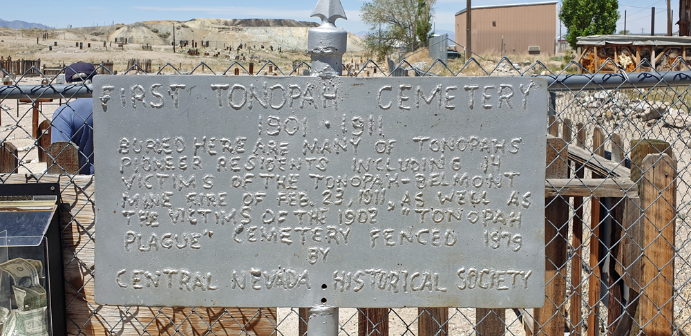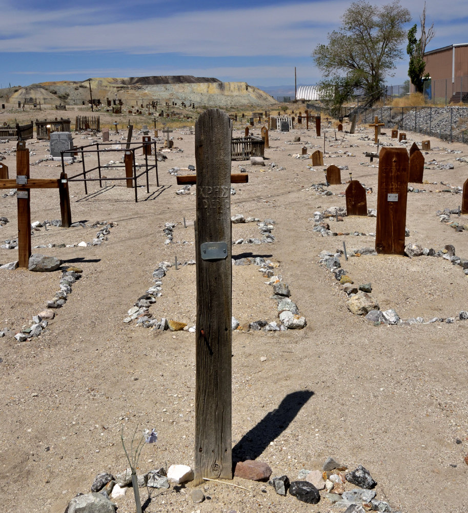 Tonopah hat auch einen sehr interessanten historischen Friedhof mit alten «Grabsteinen» – hier meistens einfache Holzbretter und manchmal Holzkreuze, ganz selten einmal wirkliche Steine. Viele der Gräber sind mit („modernen“) kleinen Metalltafeln beschriftet, auf denen oftmals nicht nur der Name, sondern auch Alter und Todesursache aufgelistet sind. Viele der hier Bestatteten kamen am 23. Februar 1911 bei einem Feuer in der Belmont-Mine um, aber es finden sich auch zahlreiche andere Schicksale wie (Minen-)Unfälle oder Krankheiten, die zu einem Hinscheiden meist noch vor 30 geführt haben (sehr häufig scheint Lungenentzündung gewesen zu sein). Es hat überraschend viele Frauen – teils vom ältesten Gewerbe der Welt –, die dagegen recht oft ein hohes Alter erreicht haben. Wir entdecken auch eine sehr schöne, leider zerbrochene und deshalb kaum leserliche Marmor-Platte eines im Jahre 1906 (?) mit 33 Jahren verstorbenen Quirin (…) Mani (?) aus Biasca.