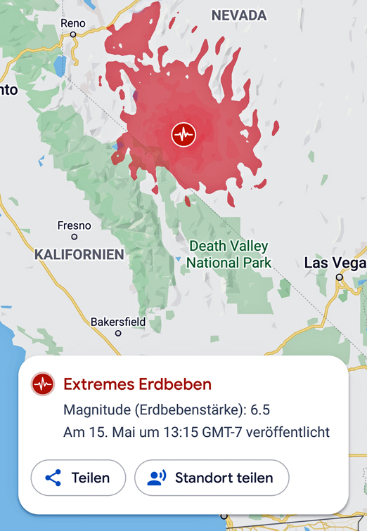 Von Bill erfahren wir dann, dass einen Tag nach unserer Abreise von den Crow Springs in den frühen Morgenstunden ganz in der Nähe ein starkes Erdbeben war, das sogar die US-95 in Mitleidenschaft gezogen hat (zum Glück kam sonst nichts und niemand zu Schaden, auch nicht im nahegelegenen Tonopah). Wir haben das Ereignis sanft und selig