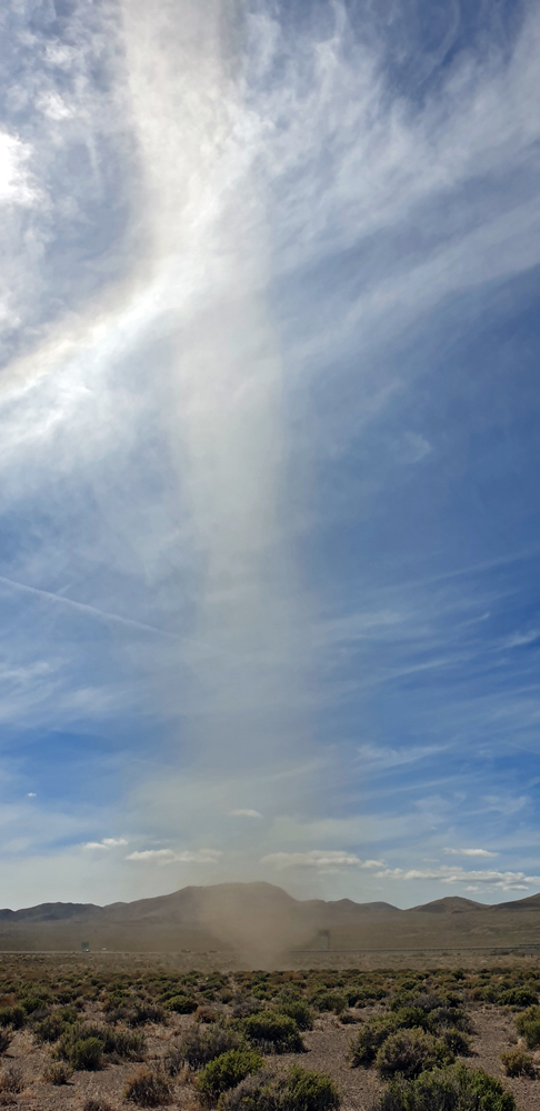 Don zeigt mir die – ohne ihn unauffindbaren – Schlafstellen chinesischer Arbeiter aus der Zeit des Trasseebaus für die Central Pacific Railroad um 1868, wo wir auch einen Dust Devil von ganz nah erleben dürfen. Das Rauschen und Brausen ist unbeschreiblich!