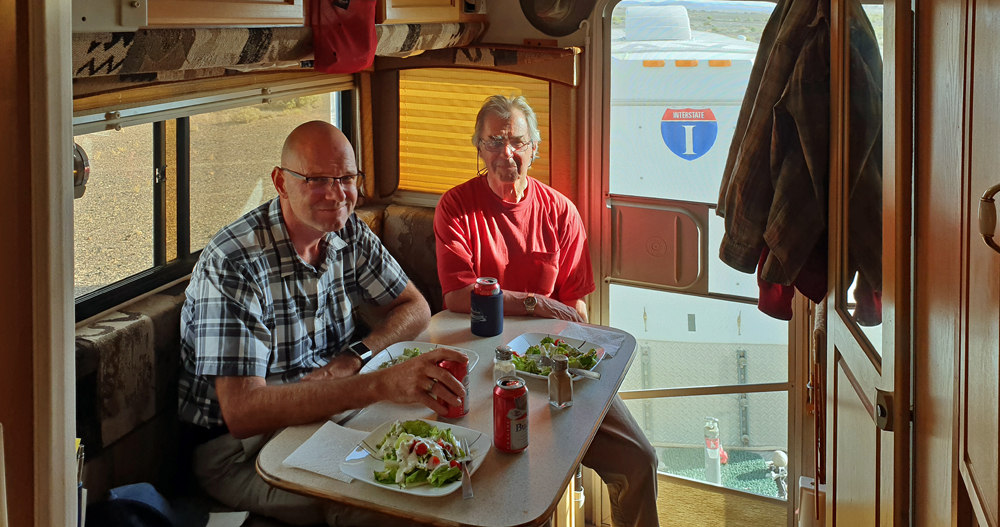 Am nächsten Tag erledigen Don und Bill noch dies und das. Wir müssen heute «mal kurz» nach Las Vegas fahren (eine «kleine Runde» von 240 mi/390 km von/nach Beatty…): Ozy hat von Thuren Suspension Technology einen neuen Stabi zu einem Workshop in Las Vegas geliefert bekommen, da der eingebaute einen Fabrikationsfehler hatte und eine Schweissnaht gerissen ist. Und da wir in absehbarer Zeit nicht mehr in diese Gegend kommen, müssen wir das Teil jetzt halt noch abholen. Nachdem wir das grosse Paket in Empfang genommen haben (Aaron von Thuren hatte netterweise noch je 2 T-Shirts für Ozy und mich sowie einen Trinkbecher dazugelegt), besorgen wir noch dies und das im Home Depot, stocken unsere Vorräte auf (in Beatty gibt es keine Frischwaren) und machen Waschtag. Zur Belohnung – und weil wir erst recht spät am verabredeten Treffpunkt bei den Alkali Flat Hot Springs nordöstlich von Goldfield sein werden – gönnen wir uns ein Panda Express-Menü. Wegen Corona muss man die Bestellung direkt am Eingang aufgeben und zahlen und bekommt das Gewünschte dann an die Tür geliefert. Gegessen wird im Auto.