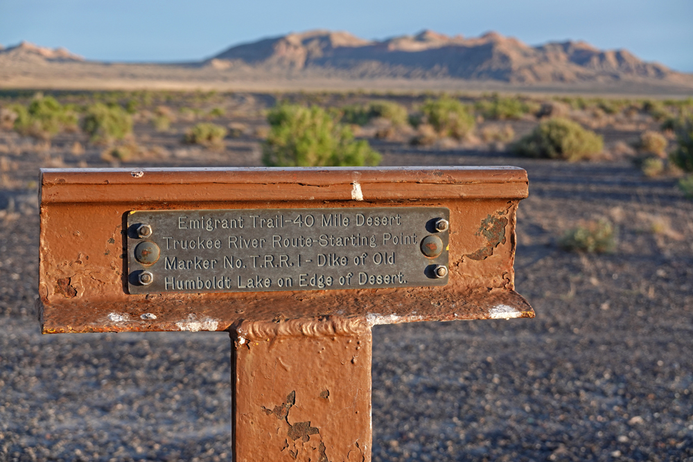 Die «40 Mile Desert» zwischen dem Riegel der «Humboldt Bar» und dem Carson oder Truckee River war der gefürchtetste Abschnitt des California Trails, auf dem Mitte des 19. Jahrhunderts unzählige Zugtiere, Wagen und auch Emigranten umgekommen sind bzw. zurückgelassen werden mussten. Die Emigranten waren nur noch etwa 240 km von ihrem Ziel in Kalifornien entfernt und der Abschnitt konnte in durchschnittlich eineinhalb Tagen bewältigt werden, doch kamen die Emigranten meist im Herbst, in der heissesten und trockensten Periode hier an und waren bereits seit vier bis sechs Monaten und etwa 3000 km unterwegs gewesen und entsprechend erschöpft. Heute ist von den Überresten dieser Tragödien, rund 1000 Gräbern, tausenden Skeletten verendeter Zugtiere und unzählige aufgegebene Wagen, ausser einigen Markern, die die ehemaligen Routen kennzeichnen, zumindest ohne genaue Suche nichts mehr zu sehen. Es finden sich zwar immer noch zahlreiche (alte) Glasscherben und auch Metallreiste, doch sind die meisten davon jüngeren Datums.