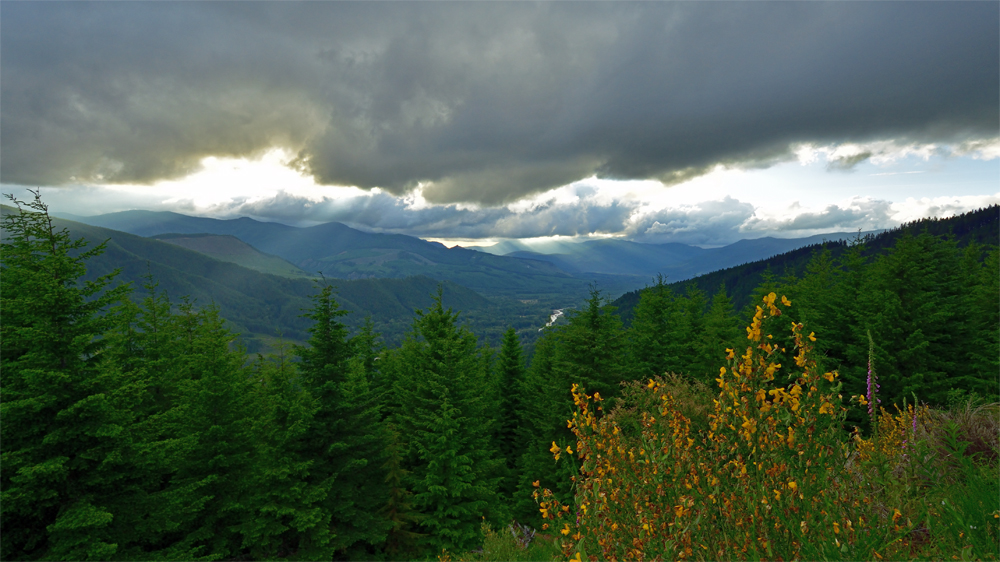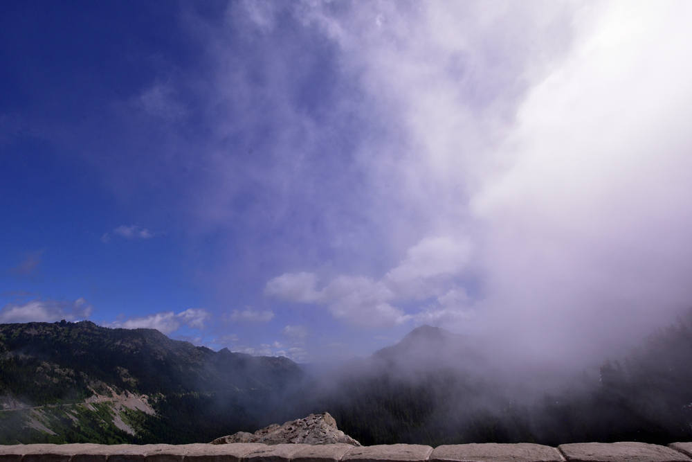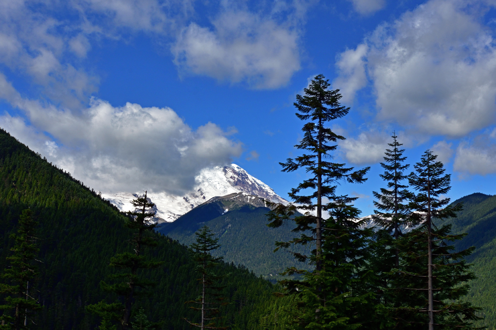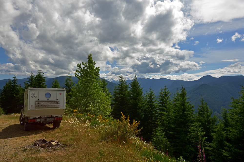 Zuerst machen wir uns aber auf zum Mount Rainier NP, der sich unseren Blicken gegenüber wieder einmal die meiste Zeit keusch hinter wirbelnden Wolken verbirgt. Immerhin erhaschen wir bei der Anfahrt einen kurzen Blick (vermutlich war er da nicht gewahr, dass wir im Anmarsch sind…) und am nächsten Tag bekommen wir inmitten schnell vorbeiziehender Wolken wenigstens noch ganz kurz einen halben Berg zu sehen. Dabei hätten wir einen coolen Übernachtungsplatz mit direktem Blick auf den gewaltigen Vulkan gehabt…