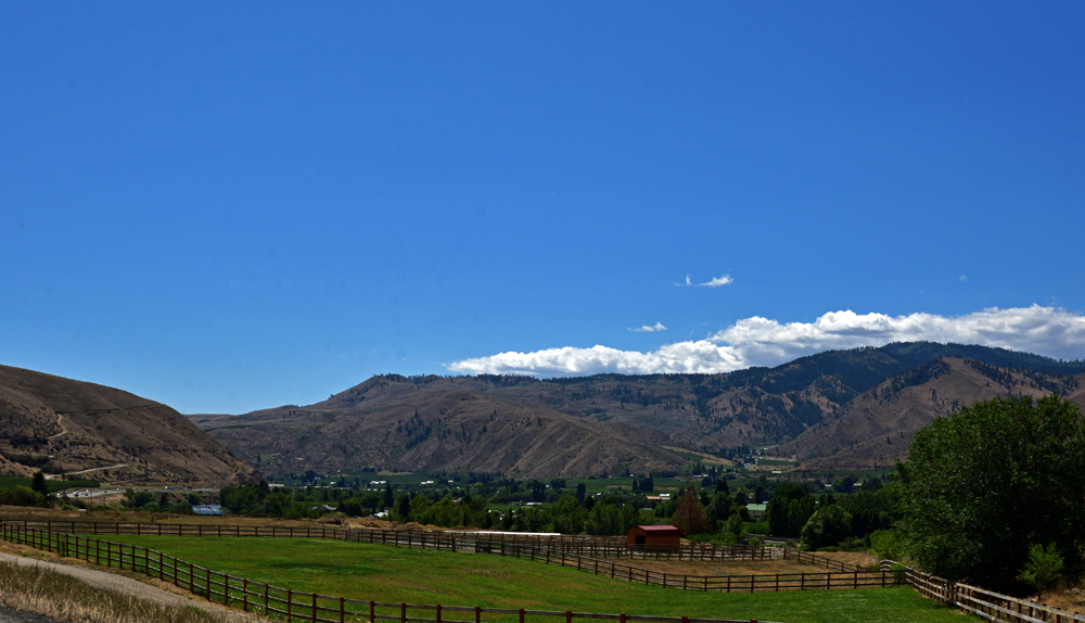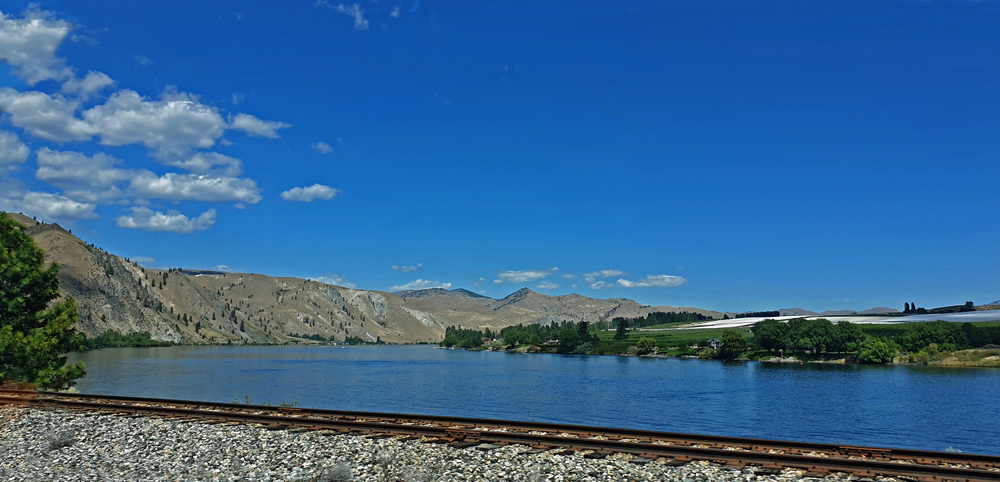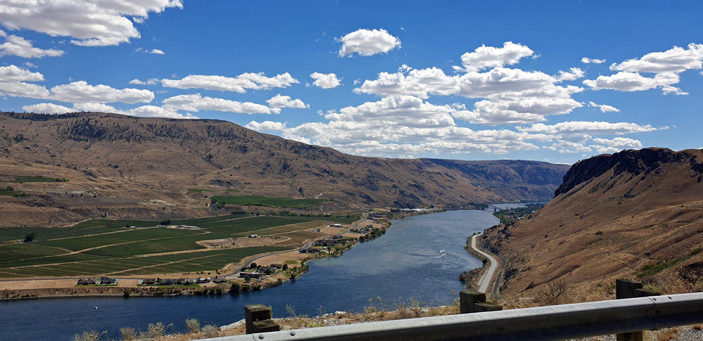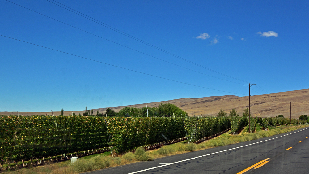 In Wenatchee treffen wir auch wieder auf den Columbia River, dem wir auf dem Scenic Byway westlich des Flusses nach Norden folgen. Der auch hier schon mächtige Fluss windet sich durch ein karges Tal, dessen Brauntöne nur gelegentlich durch das Dunkelgrün der Apfelplantagen und Weinberge auf den bebaubaren Terrassen unterbrochen werden.