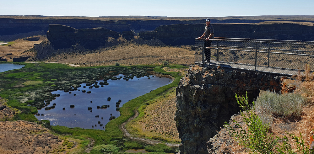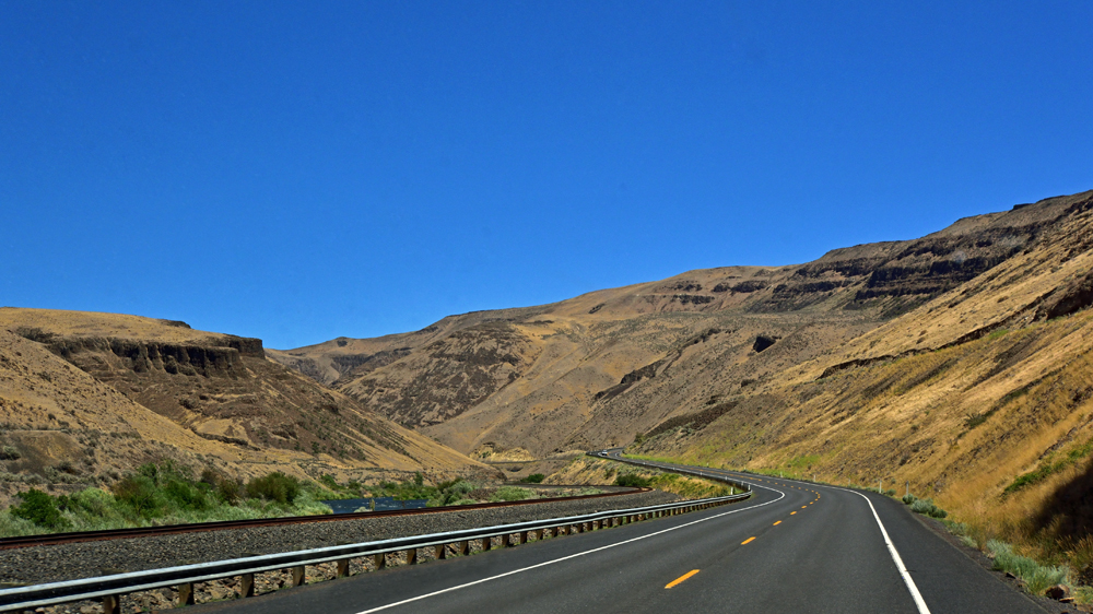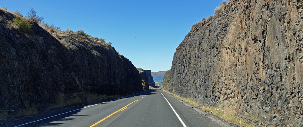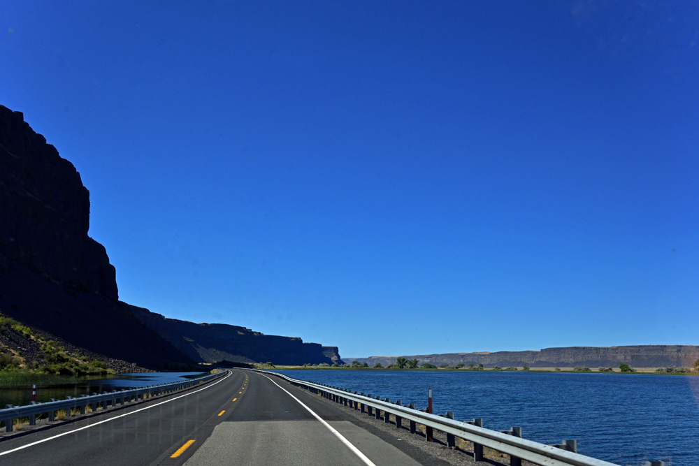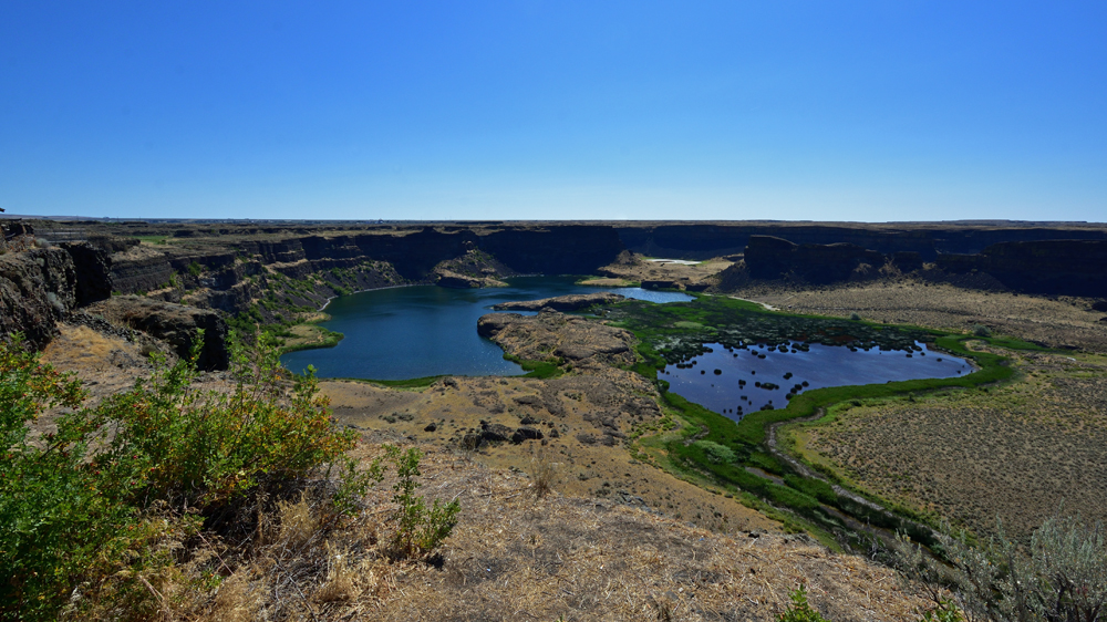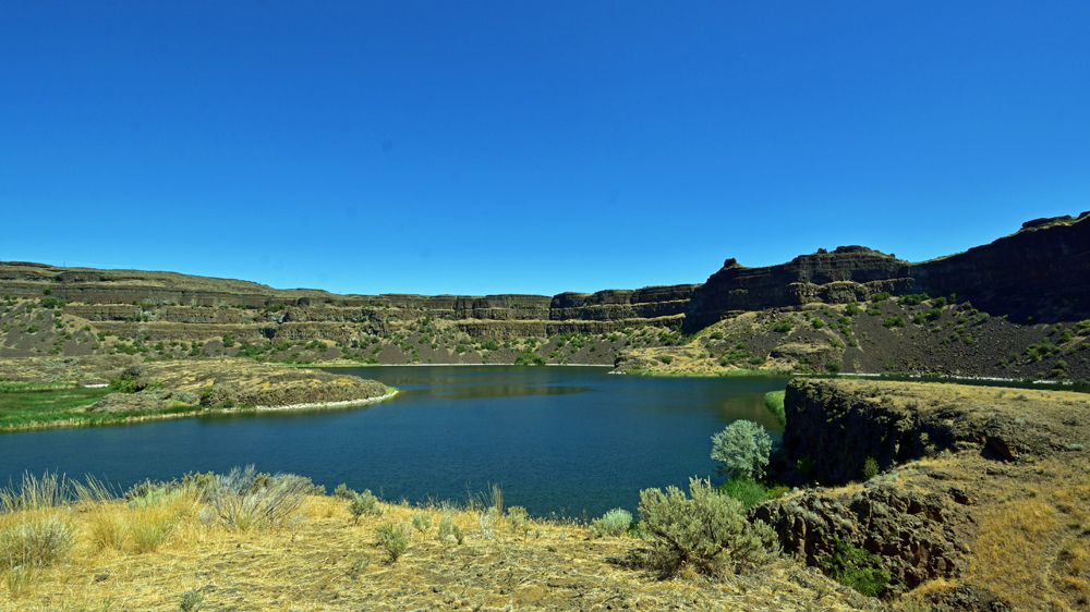 Am nächsten Tag folgen wir der Grand Coulee mit ihren von verschiedenen übereinander abgelagerten Lavaströmen gebildeten Seitenwänden nach Süden. Die Grand Coulee – wie auch die anderen, parallel verlaufenden Coulees – wurden durch verschiedene, gewaltige Fluten des eiszeitlichen Lake Missoula geformt. Der obere, breite Teil der Grand Coulee wird vom 40 km langen Banks Lake-Stausee ausgefüllt. Der Teil unterhalb der Dry Falls, des «grössten Wasserfalls der Welt ohne Wasser» besteht aus einem engen Canyon mit verschiedenen grösseren und kleineren Seen. Nach Soap Lake öffnet sich der Canyon dann in eine weite, leicht hügelige Landschaft, die intensiv für die Produktion von Getreide genutzt wird.