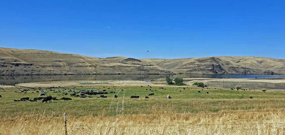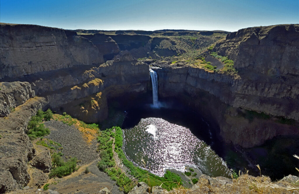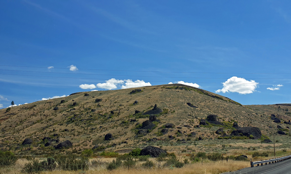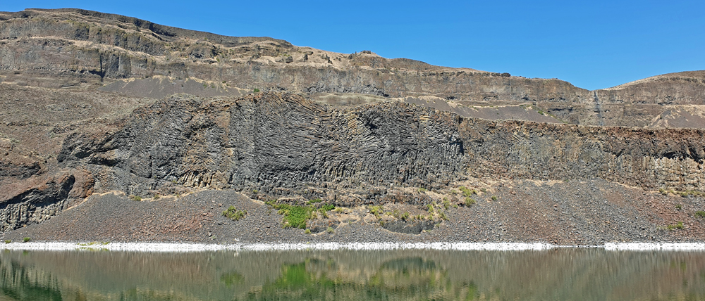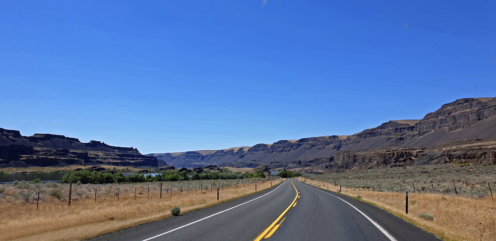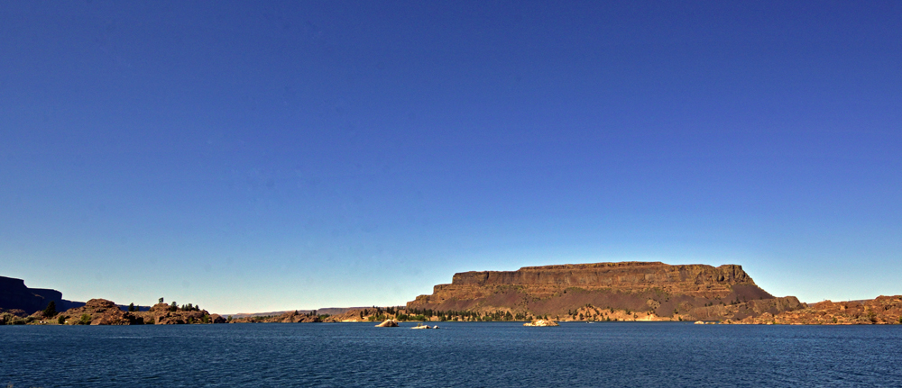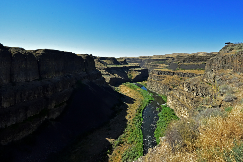 Am nächsten Tag folgen wir der Grand Coulee mit ihren von verschiedenen übereinander abgelagerten Lavaströmen gebildeten Seitenwänden nach Süden. Die Grand Coulee – wie auch die anderen, parallel verlaufenden Coulees – wurden durch verschiedene, gewaltige Fluten des eiszeitlichen Lake Missoula geformt. Der obere, breite Teil der Grand Coulee wird vom 40 km langen Banks Lake-Stausee ausgefüllt. Der Teil unterhalb der Dry Falls, des «grössten Wasserfalls der Welt ohne Wasser» besteht aus einem engen Canyon mit verschiedenen grösseren und kleineren Seen. Nach Soap Lake öffnet sich der Canyon dann in eine weite, leicht hügelige Landschaft, die intensiv für die Produktion von Getreide genutzt wird.