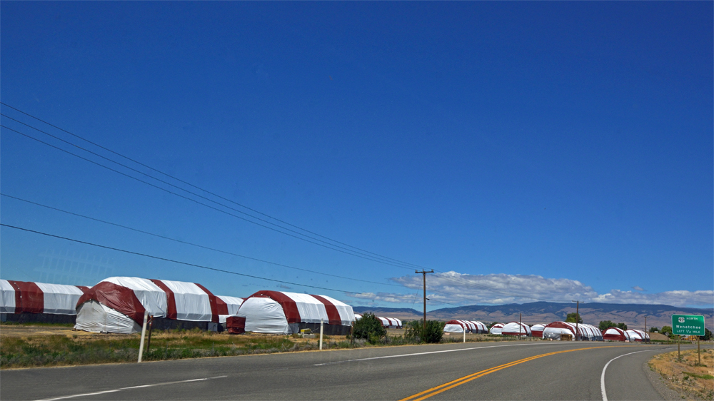 Nach dem – abgesehen vom unmittelbaren Flussufer – kargen Canyon kommen wir ins Grasland um Ellensburg, wo die grossen Heuballen durch ebensolche Bogenzelte oder mittels spezieller Blachenkonstruktionen vor dem Regen geschützt werden.