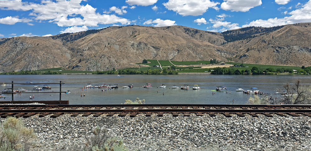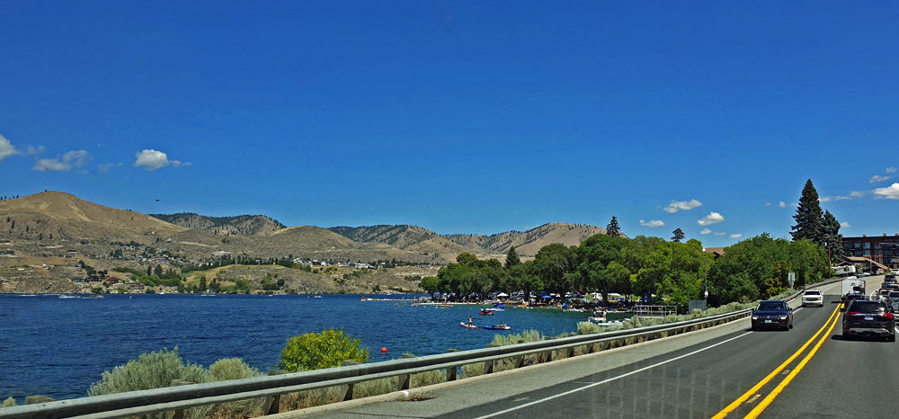 Der Sommer ist mittlerweile voll ausgebrochen und wir haben Aussentemperaturen vom um die 33 °C. Am Lake Chelan sieht es denn auch aus wie bei uns im Hochsommer: entlang der Strasse sind unzählige Autos parkiert und die Seebadi ist gestossen voll. – Nichts für uns!