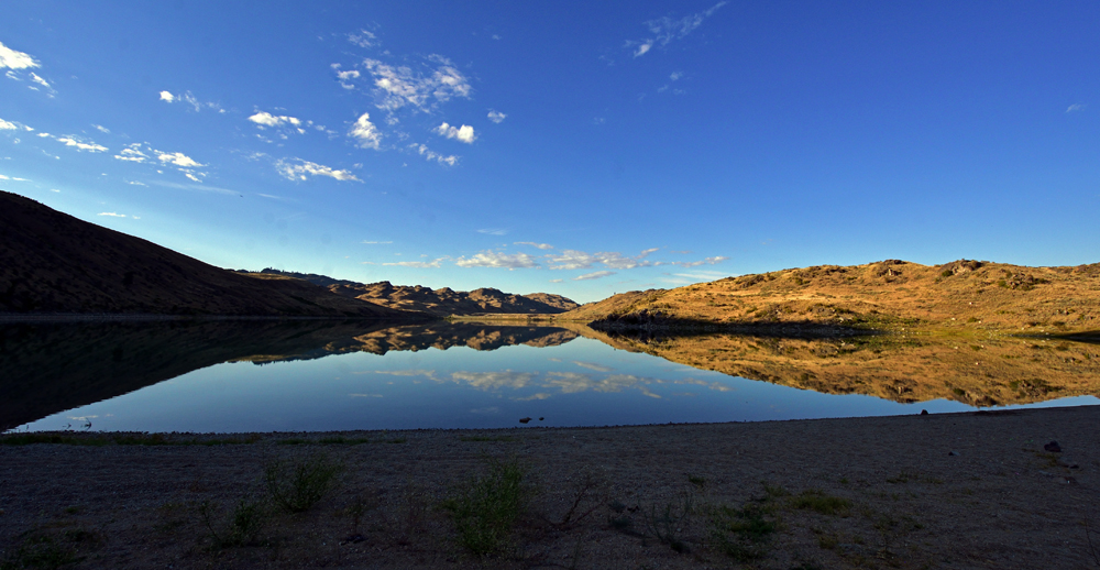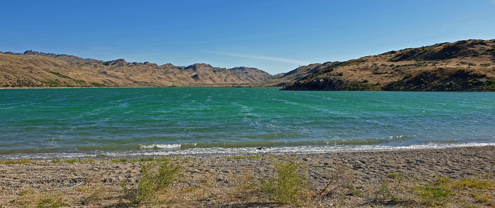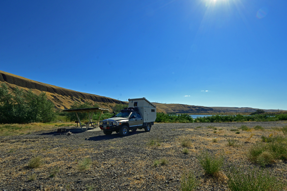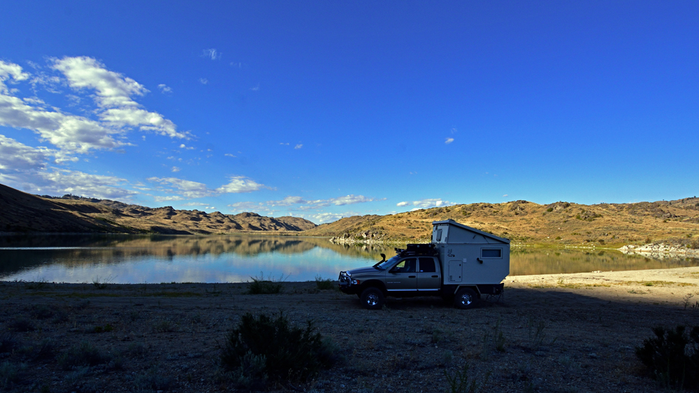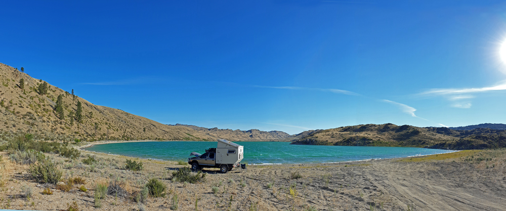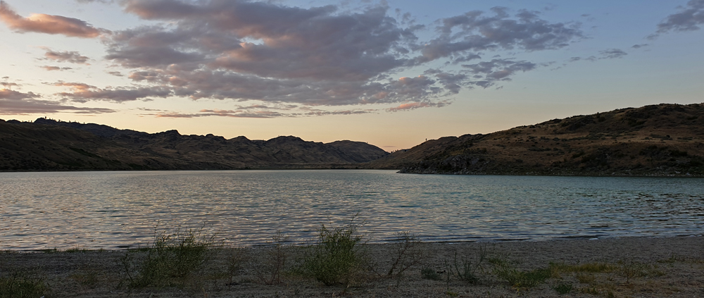 Wir fahren zum Banks Lake hinauf und suchen uns einen Übernachtungsplatz am Ufer des Osborn Bay Lake, der eigentlich nichts anderes als eine durch die WA-122 abgetrennte Bucht ist. Leider sind diverse Spots entlang des Seeufers stark vermüllt – wir sind hier wohl zu nahe an Electric City… –, aber wir haben dann doch noch Glück und finden einen freien, einigermassen sauberen Platz.
