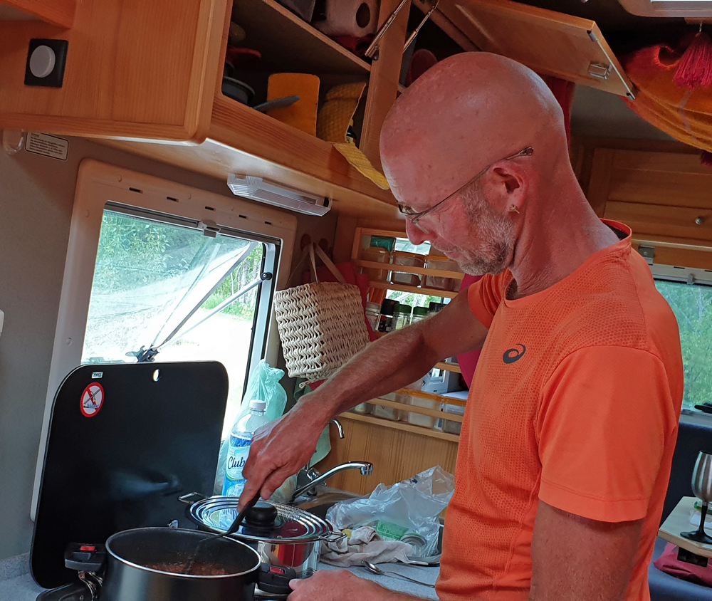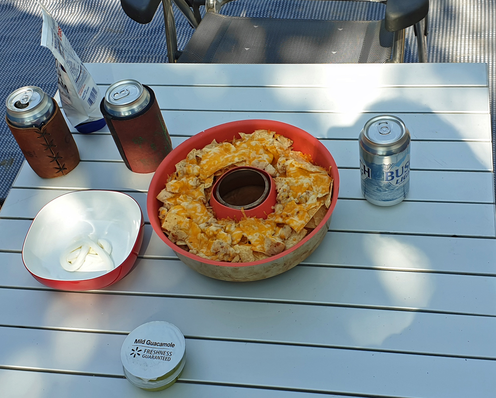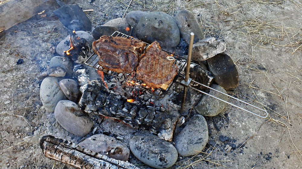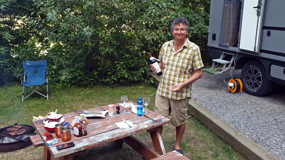 Jeannine und Jerry verwöhnen uns mit feinem Wein aus echten Glasflaschen (wegen der rauen Pisten kaufen wir nur – meist ganz annehmbaren – Black Box «Château Carton») und sind so lieb, uns sogar für die 2. Nacht auf dem Campground einzuladen!