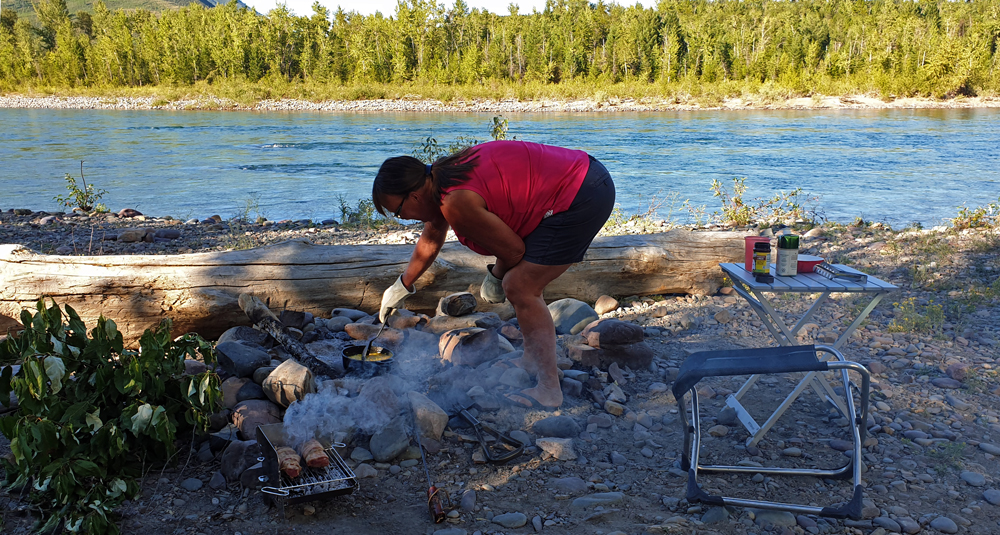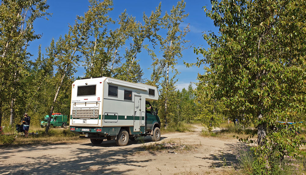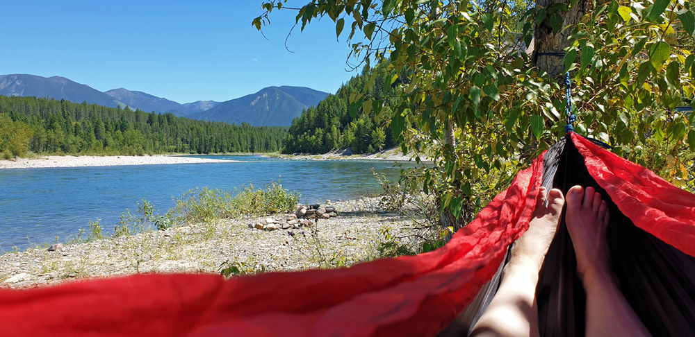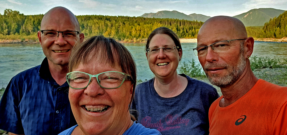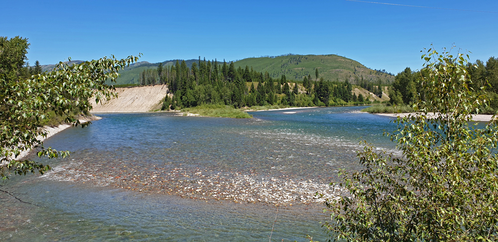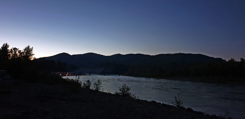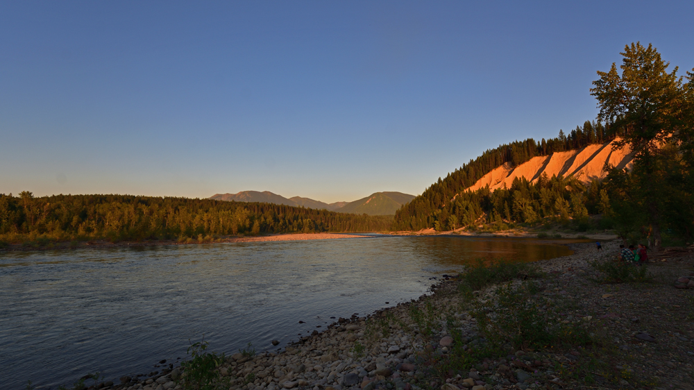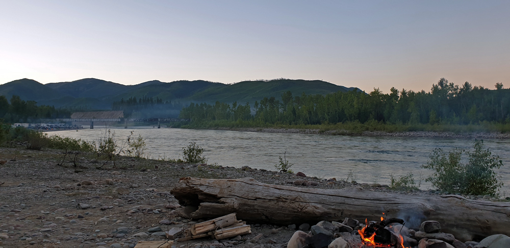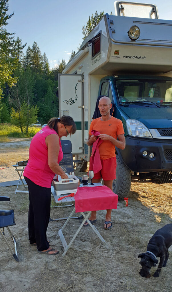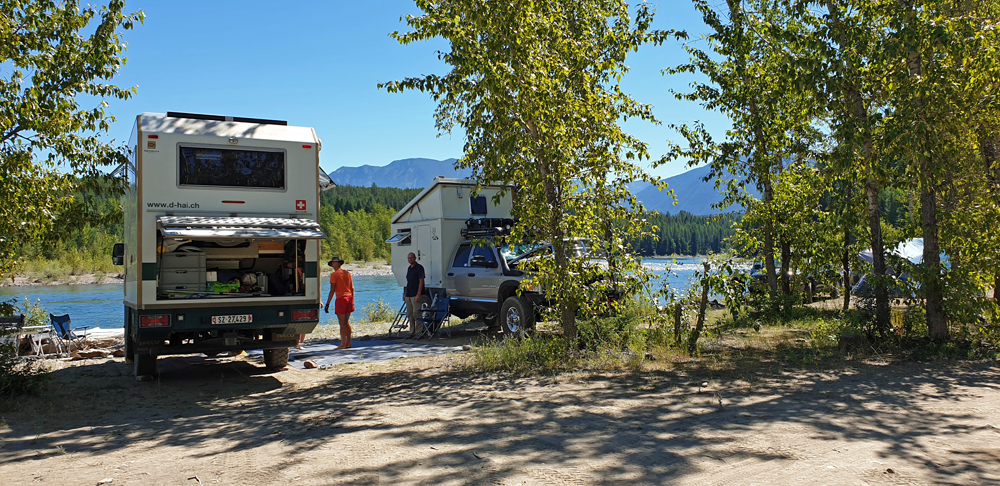 Dort haben andere Schweizer Reisefreunde, die «DHai’s» Sibylle und Hermann, bereits für uns alle einen Platz am Flathead River gefunden. Wir freuen uns sehr, die beiden und ihren Hund Shell wiederzusehen, haben wir uns doch das letzte Mal vor ziemlich genau einem Jahr auf Neufundland kennengelernt und dort oben immer wieder einmal zusammen campiert.