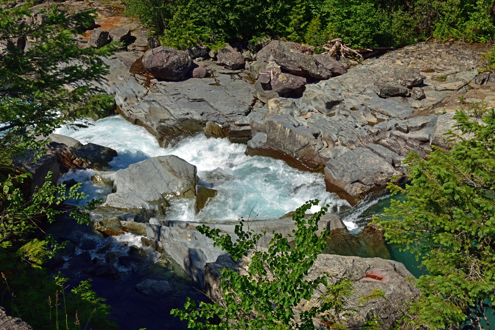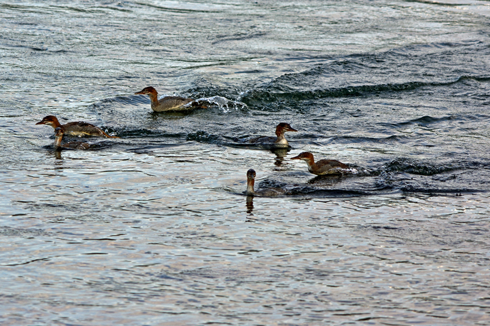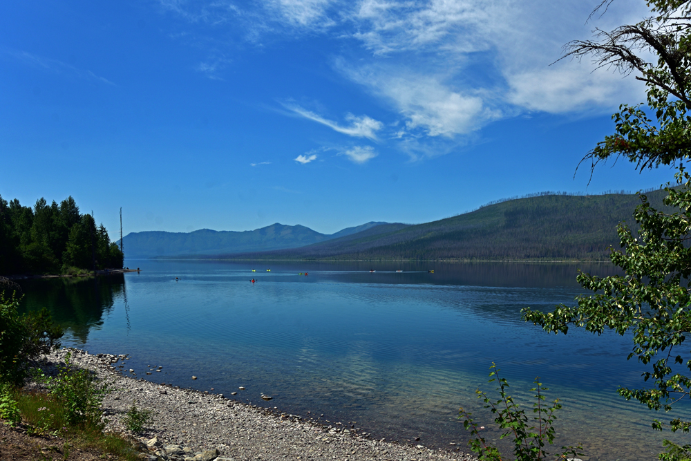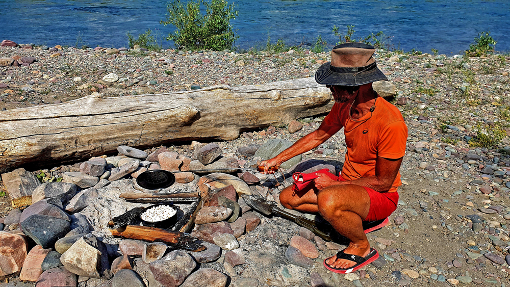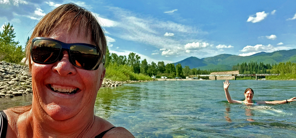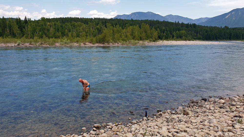 Wir geniessen eine ganze Woche zusammen und können am Sonntag sogar noch einen Platz direkt am Fluss ergattern, der auch weniger staubig ist als der erste. Es ist schön und heiss und wir verbringen die Tage mit schwatzen, im etwa 17 Grad kühlen Flathead River baden (sogar Ozy geht ‘rein!!!), einkaufen, zusammen kochen, Vögel beobachten und Wasserfahrzeugen zugucken, die über die kleinen Stromschnellen flussabwärts navigieren – von richtigen Fischerbooten über River Rafts und allerlei Aufblasbares bis zu Standup-Paddlern gibt’s hier alles zu sehen.