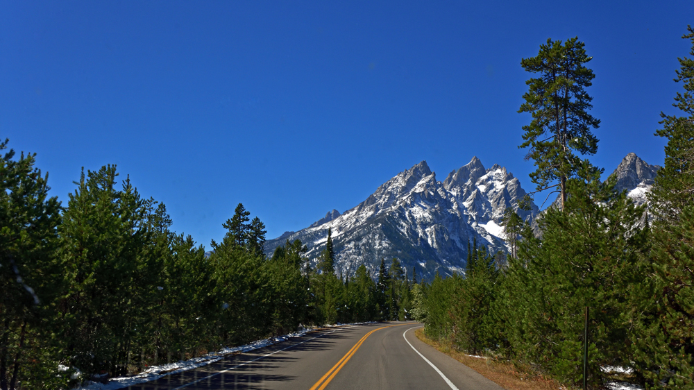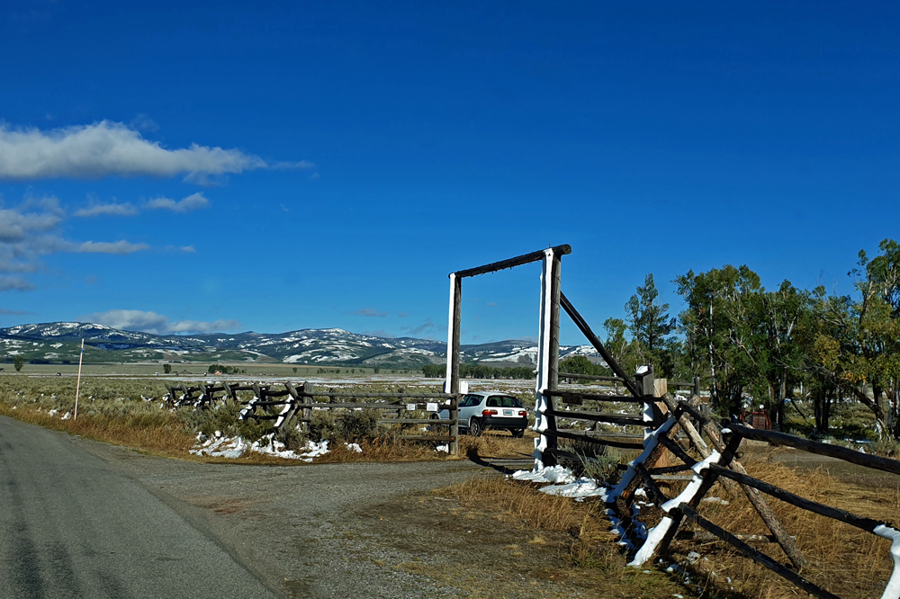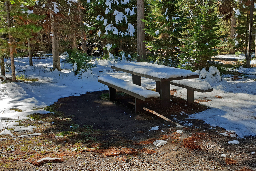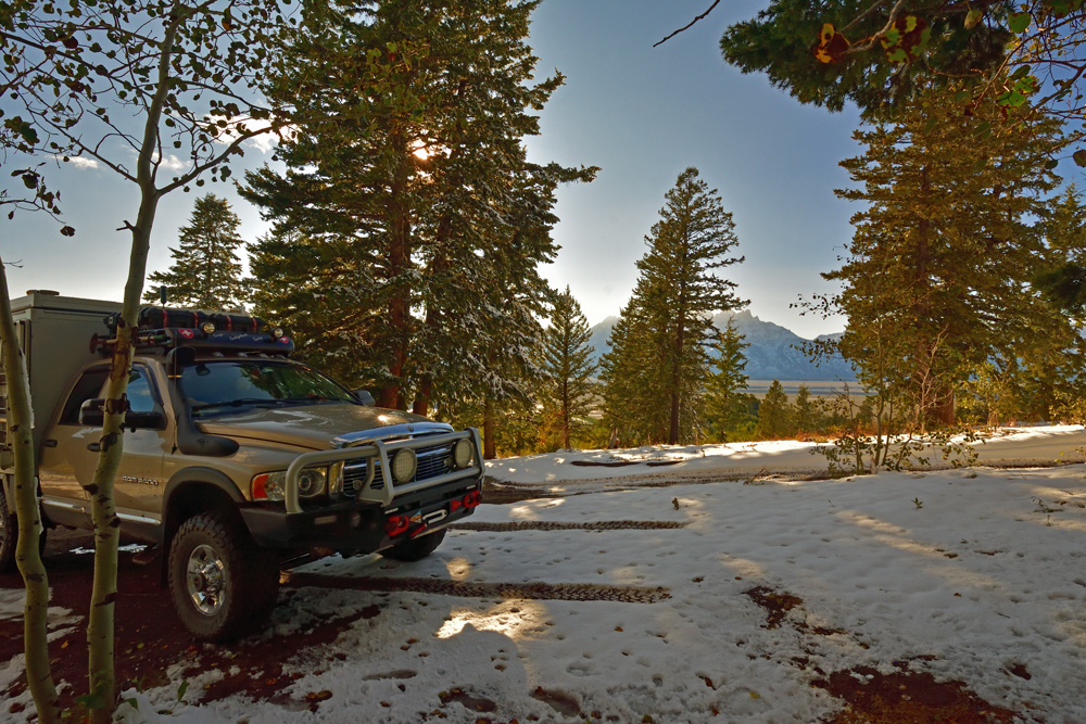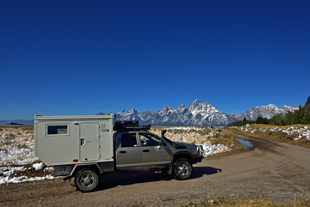Am Labor Day selbst ist es kalt und regnet den ganzen Tag. Wie stark sich das auf die Region ausgewirkt hat, finden wir dann am nächsten Tag heraus… Wir folgen dem Lauf des Snake River stromaufwärts, wobei Ozy einen geteerten Ausstellplatz zum Anlass nimmt, mal noch die Vorder- und Hinterreifen auszuwechseln. In Jackson kaufen wir in einem sehr gut bestückten Smith’s ein und fahren dann Richtung Grand Teton Nationalpark. Die weissen Berge sind von unten ja sehr malerisch, aber als wir zum Shadow Mountain im Bridger-Teton National Forest hinauffahren, wo man – an designierten Stellen – frei campen darf, geraten wir selbst in den Schnee! Die Erdstrasse ist nur mit 4×4 zu bewältigen, da sehr matschig und mit Ästen übersäht (die aufgrund der zu hohen Schneelast geknickten Bäume waren zum Glück schon weggeräumt). Wir werden dafür mit einem grandiosen Blick auf die frisch verschneiten Tetons belohnt, die sich abrupt aus der Snake River-Ebene erheben. (Wir hätten bei Swan Valley fast die Strassenkombination ID-31 und ID-33/WY-22 über die Sawtooth Range nach Jackson genommen, aber ich glaube, es war rückblickend eine gute Entscheidung, das nicht zu tun…).
